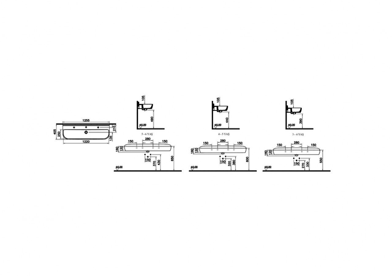 Sento Kids lavabo double, 125 cm, 1 hauteur, 3 trous pour robinet, sans trop-plein, blanc. Compatible avec cache-siphon 7404B0xx-0156.