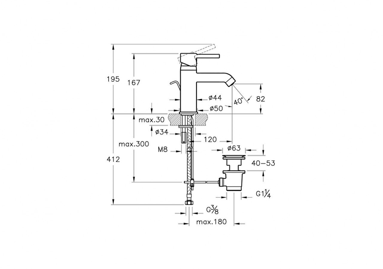 Mitigeur de lavabo, avec tirette et garniture de vidage G 1 1/4-Montage mono trou - Saillie 120 mm - Hauteur goulot 82 mm - Mousseur intégré et facile à démonter-Raccords flexibles - Avec kit de montage - Surface chromée - Kit siphon non inclus-Convient uniquement pour les lavabos avec trop-plein_Chromé