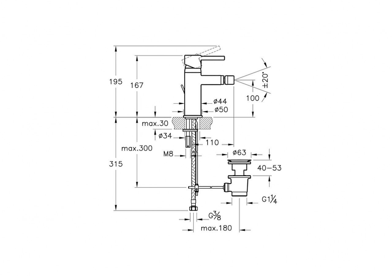 Mitigeur bidet avec tirette et garniture de vidage - Montage mono trou - Saillie 110 mm - Hauteur goulot 100 mmBec pivotant - Raccords flexibles - Avec kit de montage - Surface chromée - Kit siphon non inclus Uniquement pour bidets avec trop-plein