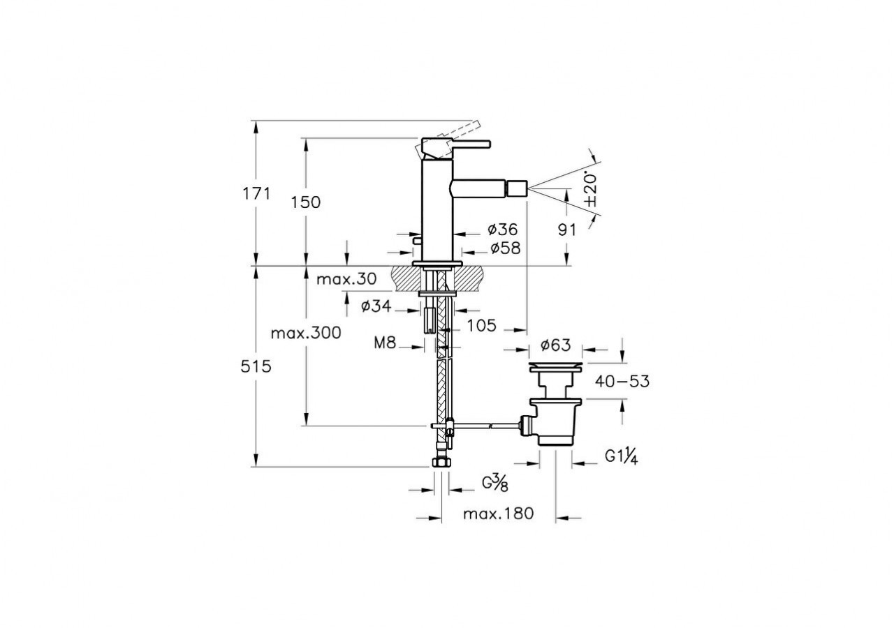 Origin mitigeur bidet, avec garniture de vidage, avec mousseur pivotant, montage mono trou, saillie 105 mm, hauteur goulot 91 mm, cart.a.disques céram., racc. fl.,kit de montage, surface chromée. Économie d'eau : Limite 5 l / min.