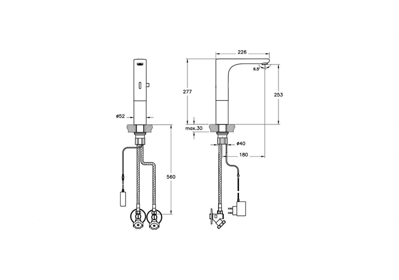 Mitigeur électronique Haut avec capteur sensoriel- Économie d’eau : 1,3l/min - Sans garniture de vidage -Montage mono trou-Saillie 142 mm - Hauteur goulot 113 mm - 6 V - Mousseur intégré - Vanne magnétique-Raccords flexibles - Avec kit de montage - Chromé_sur secteur