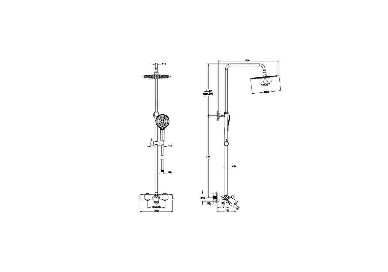 Aquaheat Bliss 250 B col. avec mit.thermo. bain/douche 20l/min, p. de tête pluie ronde en métal D250mm, débit 12l/min, col.en acier inox chromé, flex.de dou. gaine lisse 1750mm (anti-torsion) douchette avec 3 jets Aquaspray, Aquamassage, Aquasoft, Ø120mm, débit 9l/min