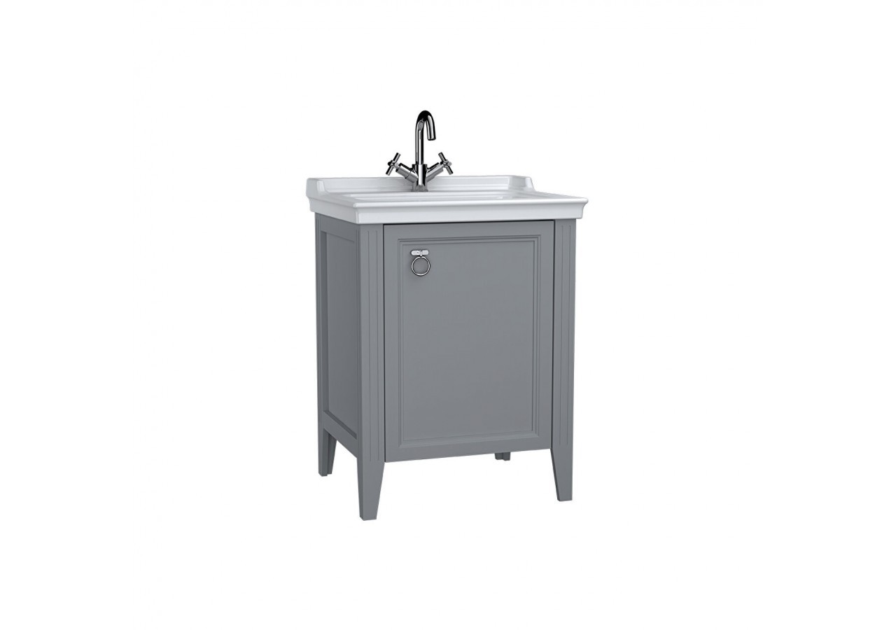 Valarte meuble avec plan céramique, 65 cm, avec porte, fermeture douce, 1 trou central pour robinet, avec trop-plein, poignées à passe doigt chromées, caisson MDF et film polymère, montage mural, gris mat, droite