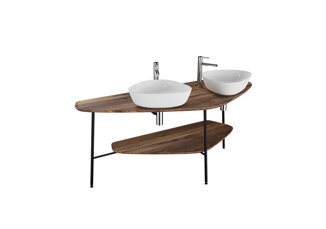 Plural console, asymétrique, 161,5 cm, chêne foncé (bois massif), 3 pieds, piètements métal noir mat, pour double vasque, avec fixation, compatible avec vasque #7812. Livrée non-assemblée.