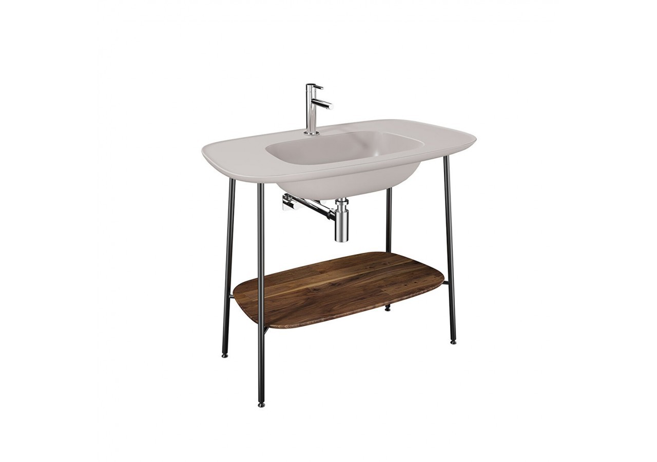 Plural console avec plan céramique, taupe mat, VitrA Clean,sans trop-plein, 1 trou pour robinet, avec crépine pour lavabos VitrA Clean, 1 étagère en chêne foncé (bois massif), 4 pieds, piètements métal noir mat, 99,5 cm. Livrée non-assemblée.