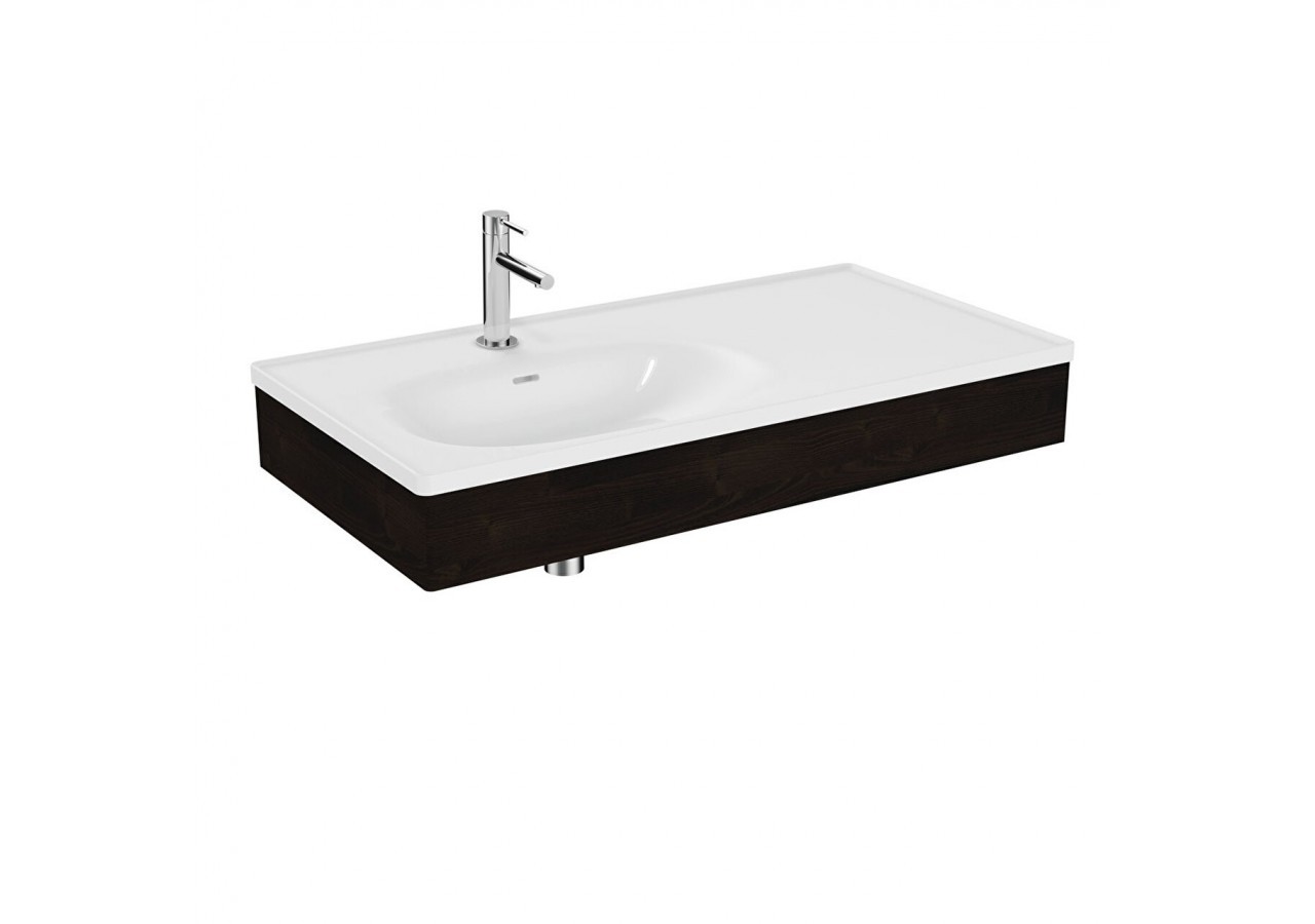 Equal plan céramique asymétrique, blanc, VitrA Clean, mural, bac à gauche, trou pour robinet, trop-plein en forme d'amande, avec panneau en bois (12 cm hauteur), caisson MDF et film polymère, orme, 100 cm