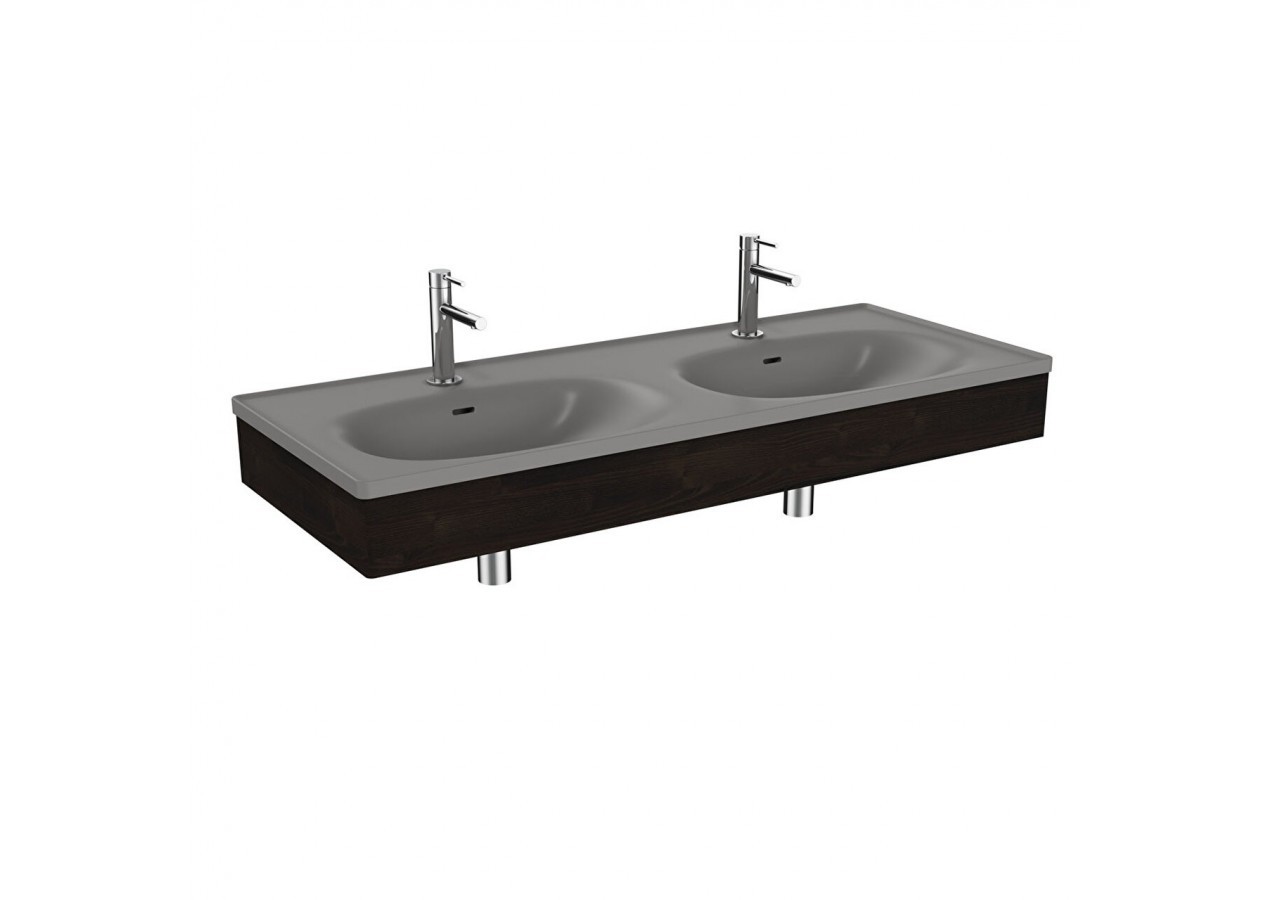 Equal plan céramique, lav. double, VitrA Clean, mural, 1 trou central pour robinet par bac, 1 trop-plein par bac en fgris pierre mat & orme d'amande, avec pann. en bois (12 cm hauteur), caisson MDF et film polymère, gris pierre m. & orme, 1300 mm