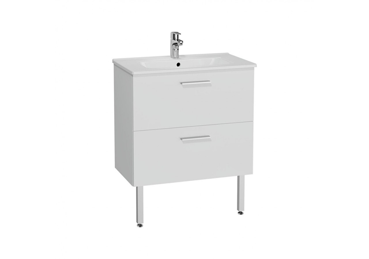 MIA set de meuble avec plan céramique,70cm,trou de robinet,trop-plein,2 tiroirs,fermeture douce,poignées chromées,melaminé décor,blanc brillant,2 pieds plastique,siphon en plastique, sans miroir et éclairage.Livré monté.