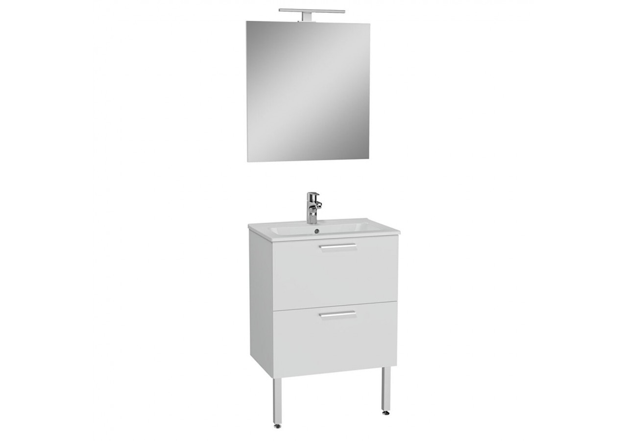 MIA set de meuble avec plan céramique,60cm,trou de robinet,trop-plein,2 tiroirs,fermeture douce,poignées chromées,melaminé décor,blanc brillant,pieds plastique,miroir avec éclairage LED(2,5w,6.500K,170Lumen,IP44,classe énergétique A),siphon en plastique Livré monté.