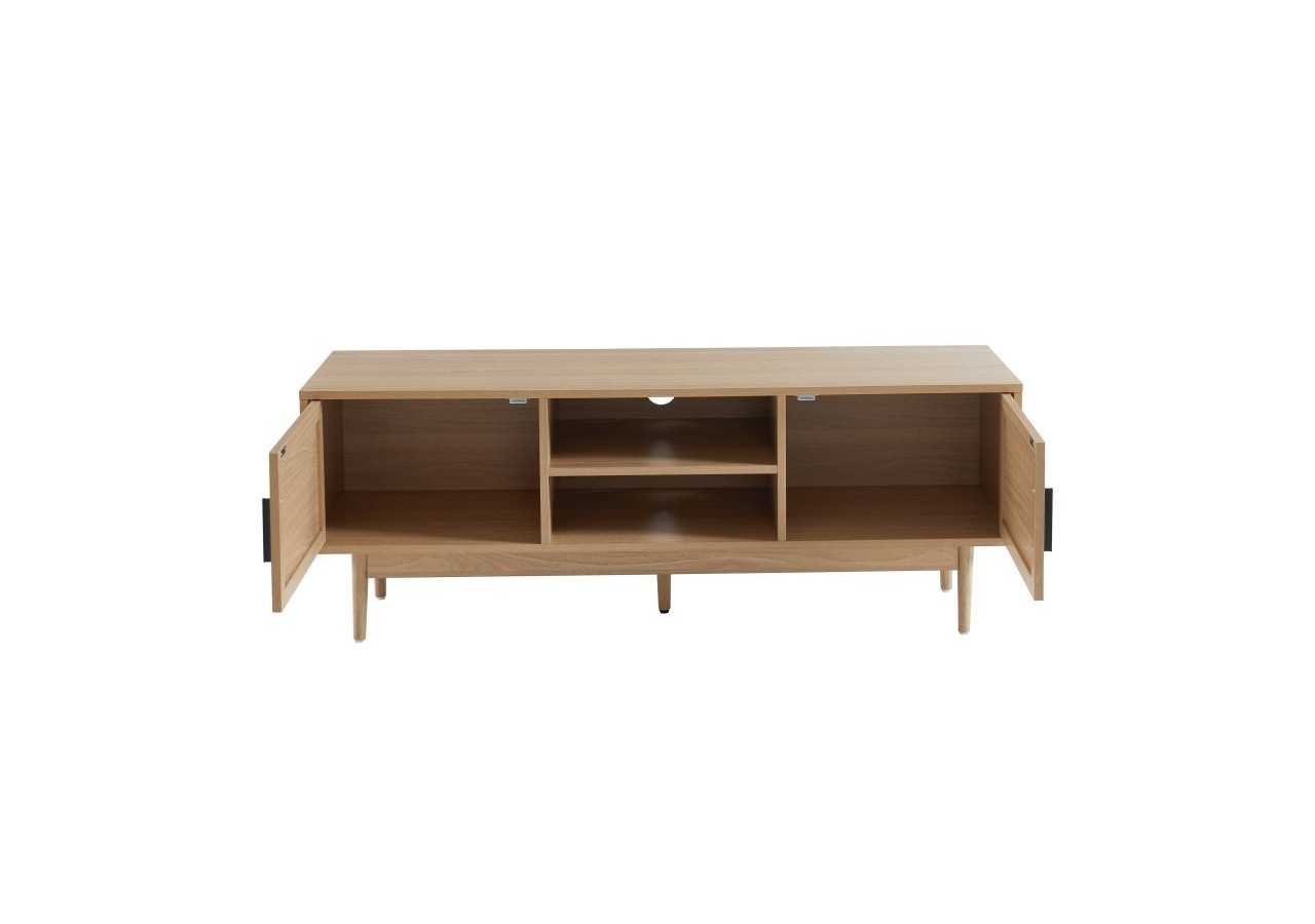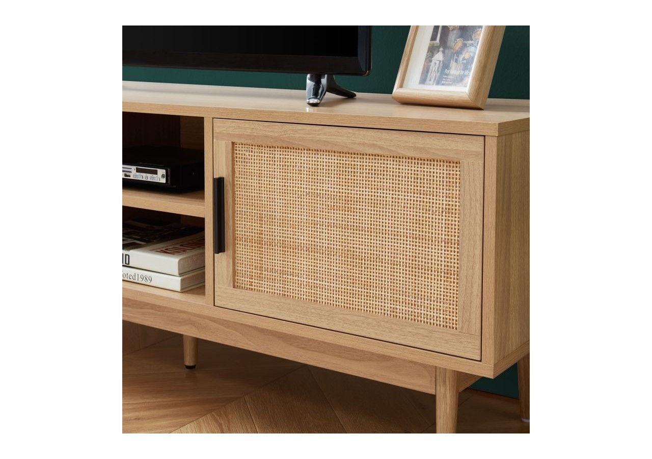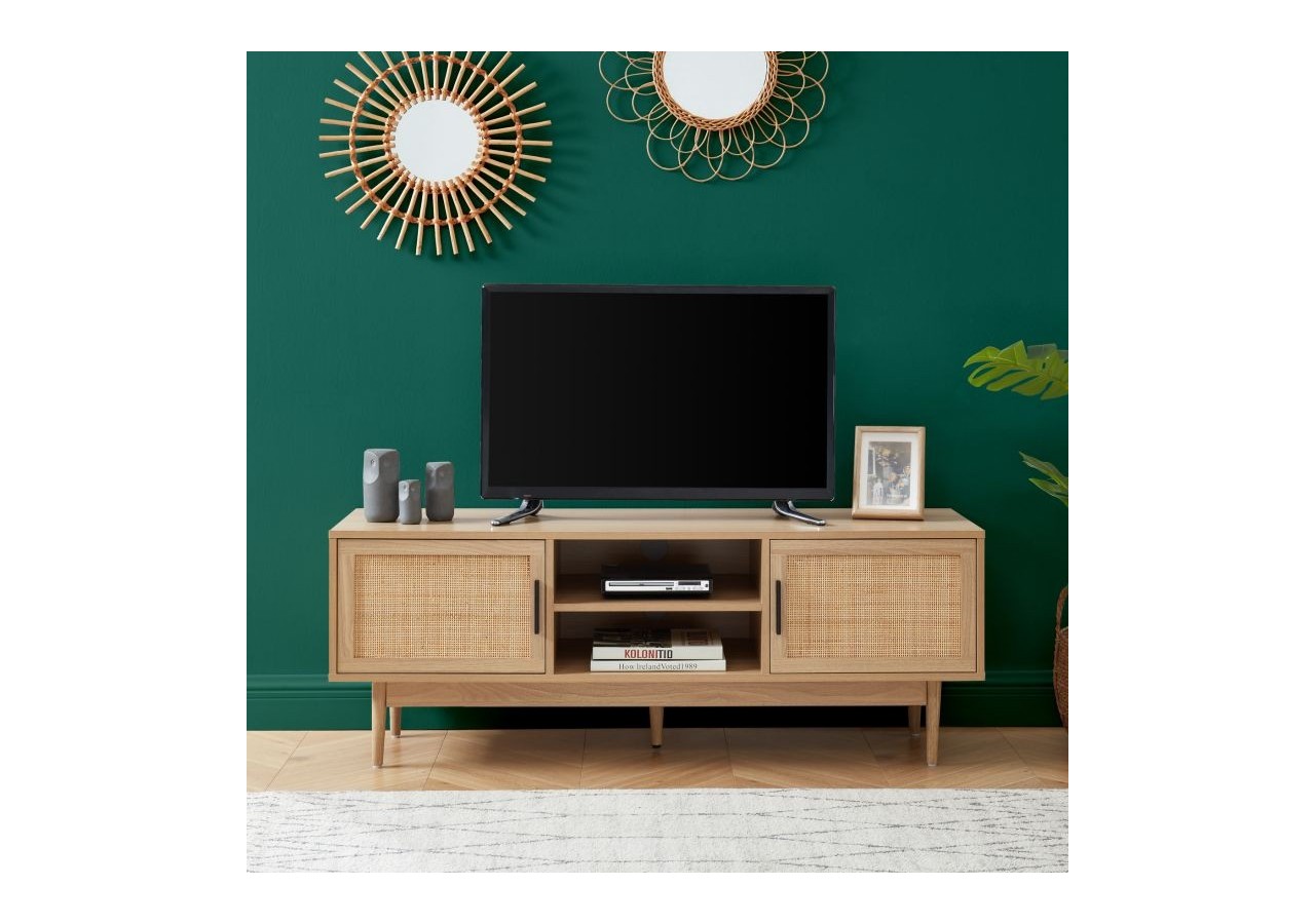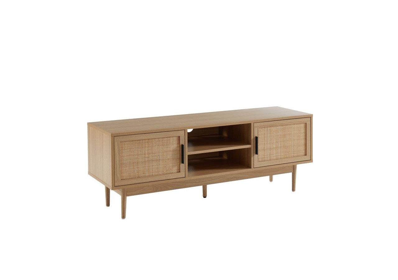 - 2 portes habillées de cannage en rotin- 5 pieds en bois massif d'eucalyptus recouverts de feuille vinyle effet chêne- Avec passe-câbles- Dimensions : L130 x P39.5 x H48.5cmLivraison :