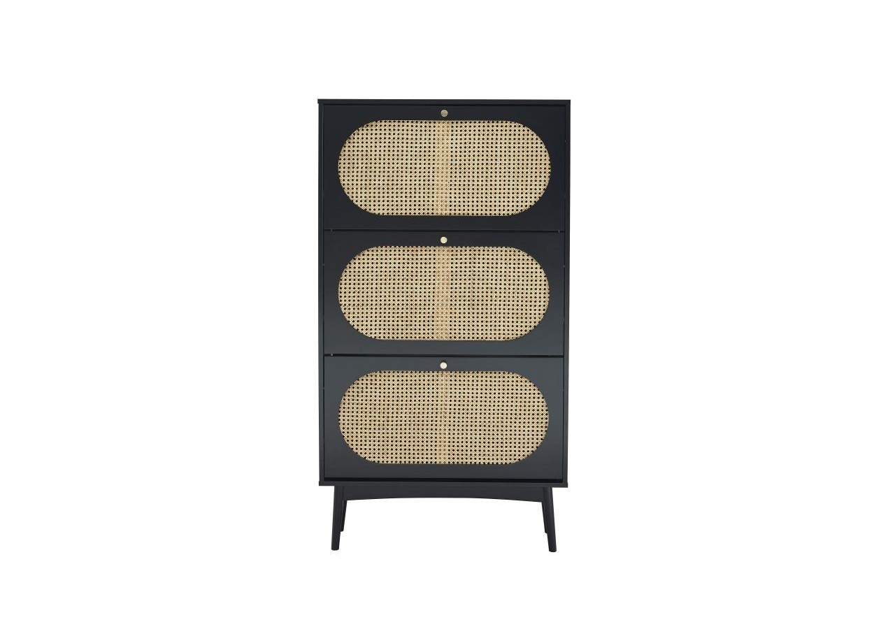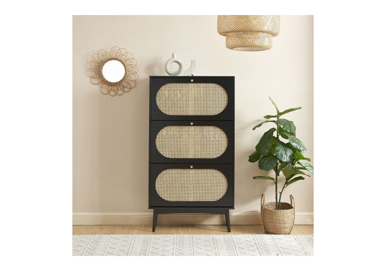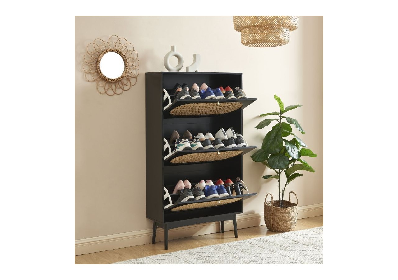 La gamme ANATOLE mise sur l'alliance du noir et du cannage. Pour une entrée bien organisée, misez sur le meuble à chaussures ANATOLE. Ce dernier vous permettra de ranger jusqu'à 18 paires de chaussures en toute facilité.