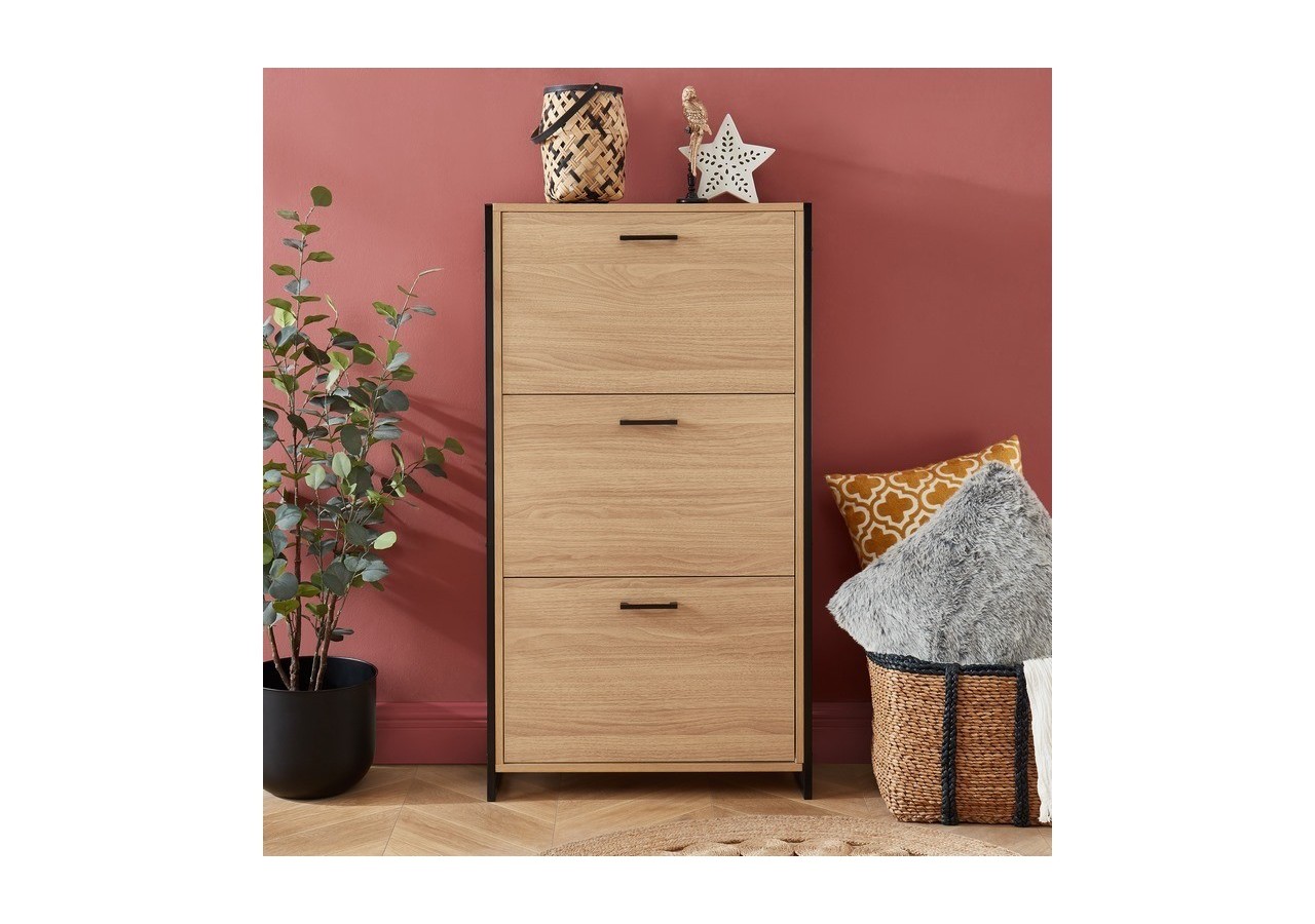 Meuble à chaussures industriel ARCHI - 3 portes - Structure en panneaux de particules et métal laqué noir - Revêtement en papier décor bois - Dimensions : L63,2 x P23,5 x H117,5cm.