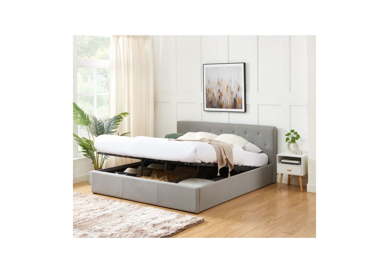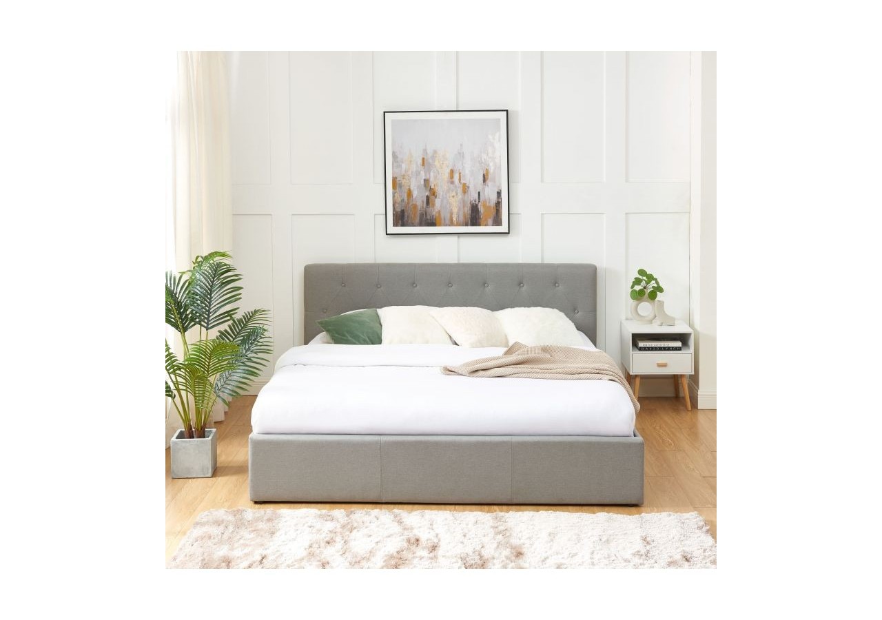 Bon à savoir : le lit coffre BAHIA en tissu gris existe en 140x160 et 160x200.
