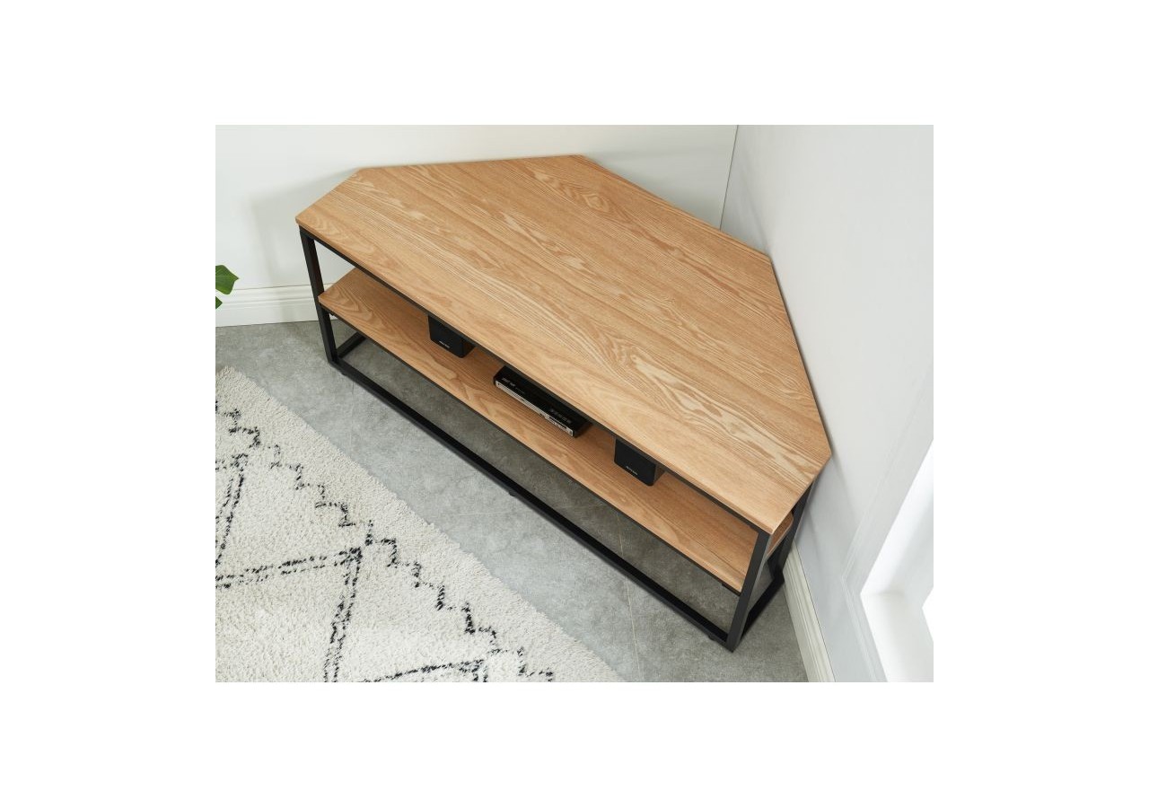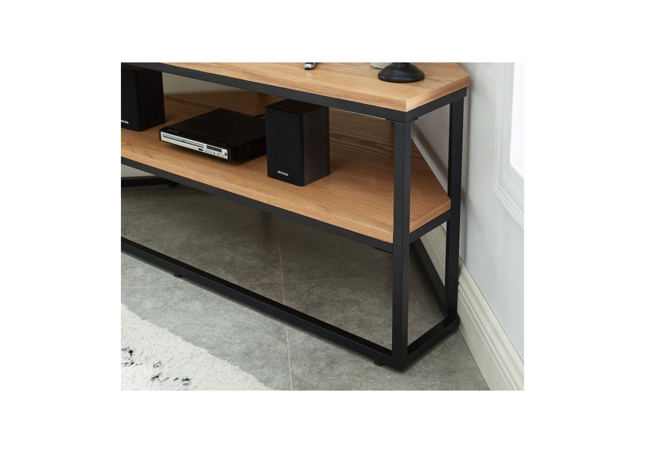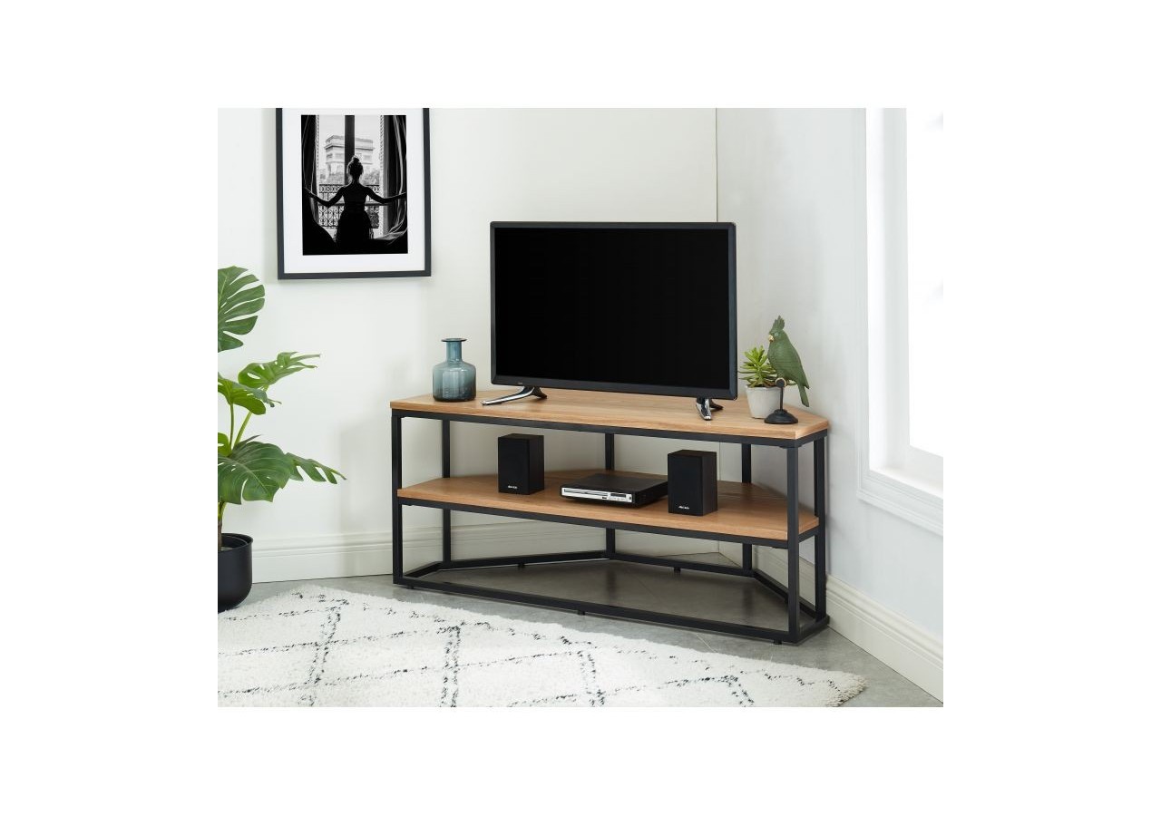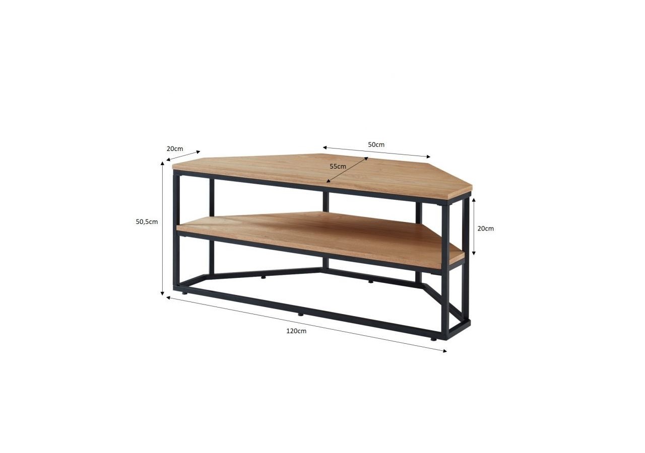 Meuble TV d'angle BRIXTON - 2 étagères - Matière des tablettes en MDF - Revêtement en placage frêne - Piètement et structure en métal noir - Pieds avec patins en plastique - Dimensions : L120 x P55 x H50,5 cm.