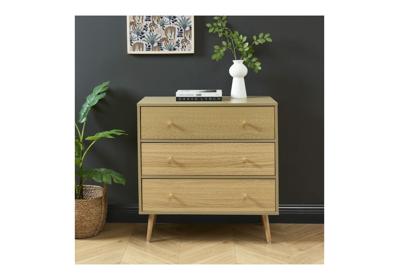 Vous êtes à la recherche d'un meuble de rangement pour votre chambre à coucher ? Optez pour cette commode 3 tiroirs CAPUCINE. On aime tout particulièrement son design, à la fois de style rétro et scandinave grâce à ses motifs délicat et ses pieds en bois massif évasés.