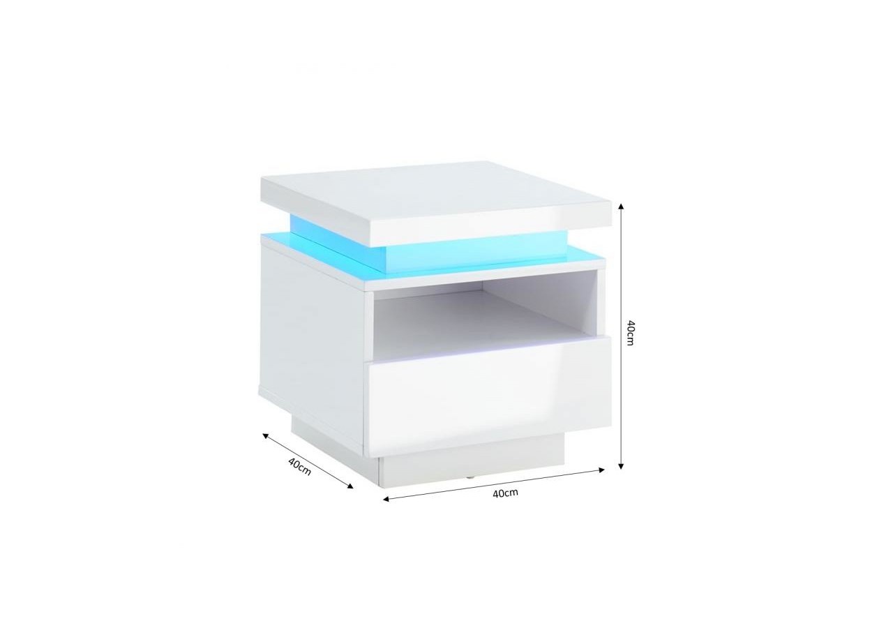 Table de chevet à LED COSMOS - Structure en MDF - Revêtement laqué blanc brillant - 1 tiroir et 1 niche de rangement - Eclairage LED - Dimensions : L40 x P40 x H40cm