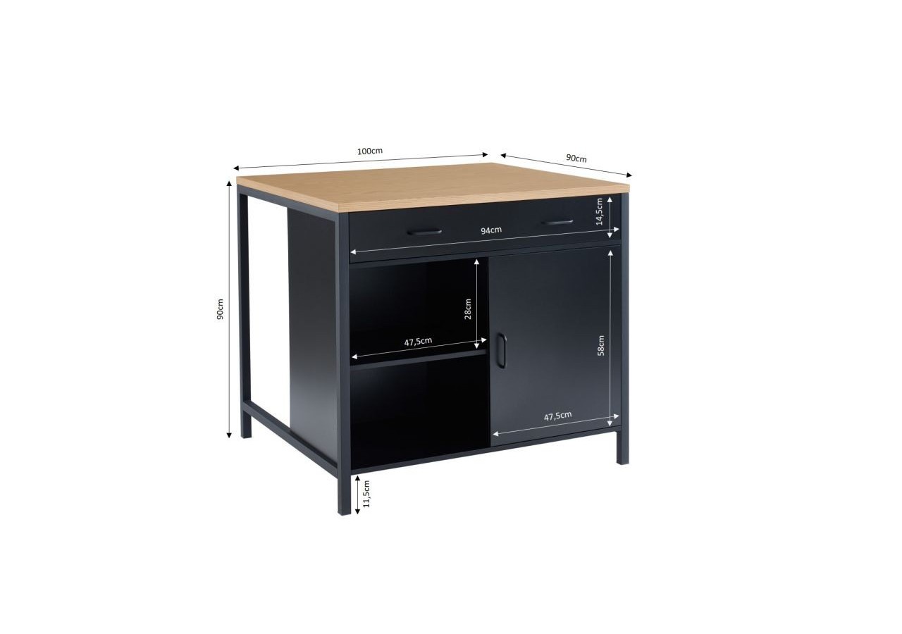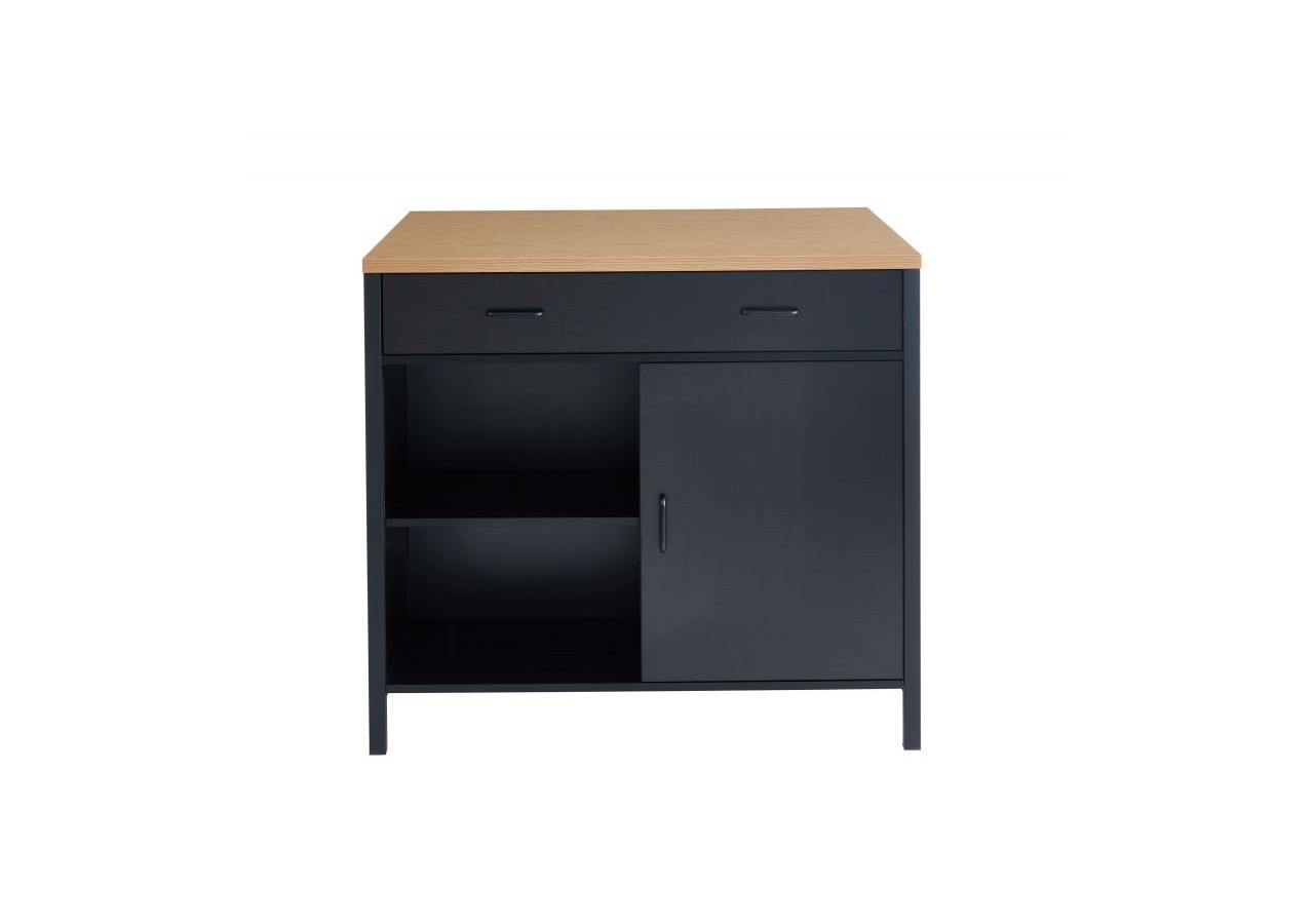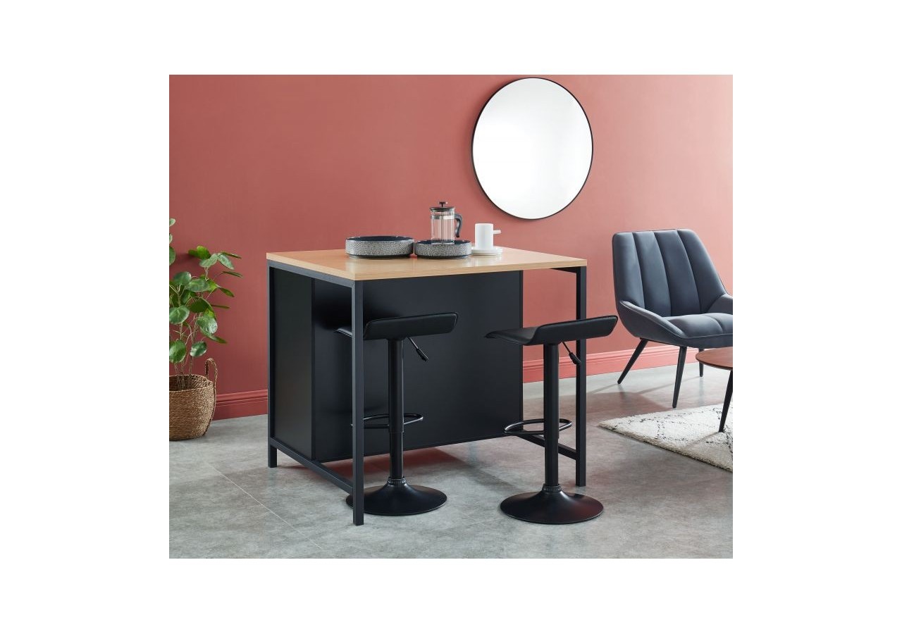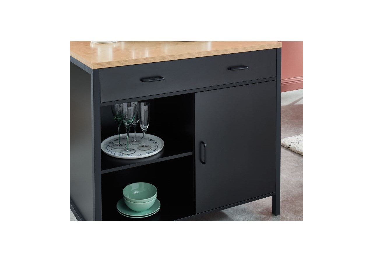 En plus d'être ultra pratique, cet îlot affiche toutes les dernières tendances en matière de mobilier d'intérieur : son revêtement noir mat, son plan de travail effet chêne naturel, sans oublier ses poignées en métal noir !
