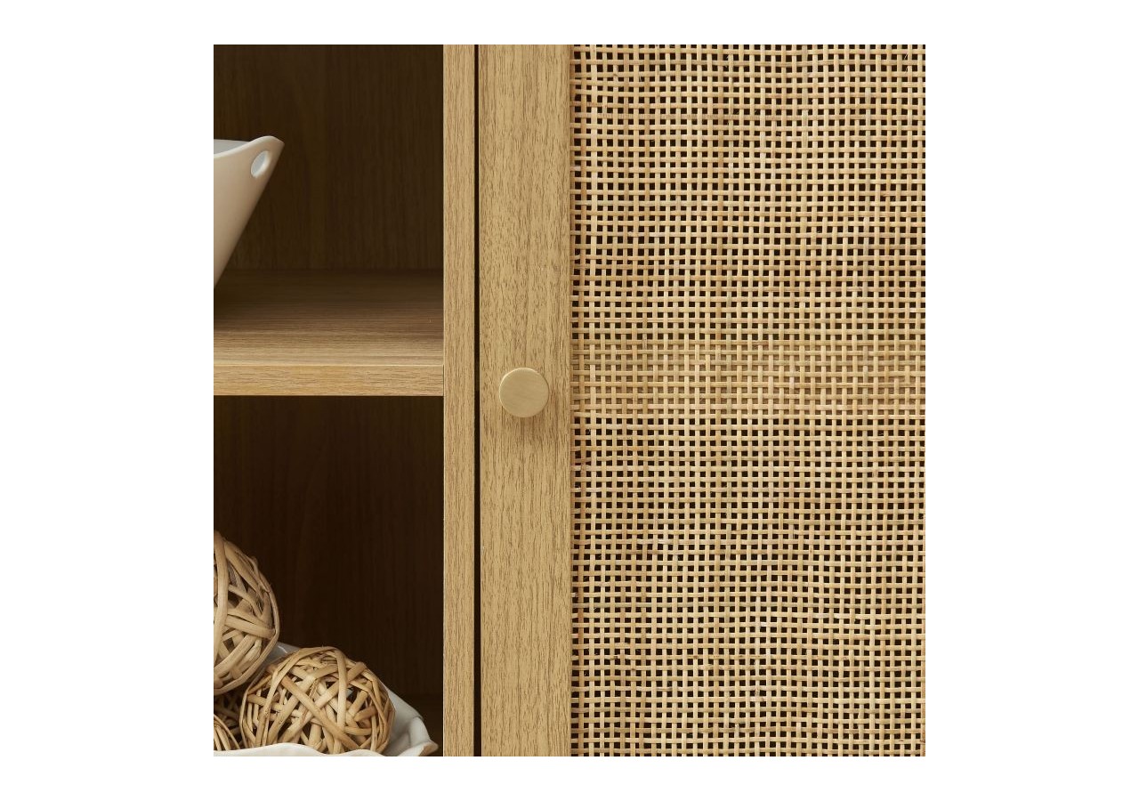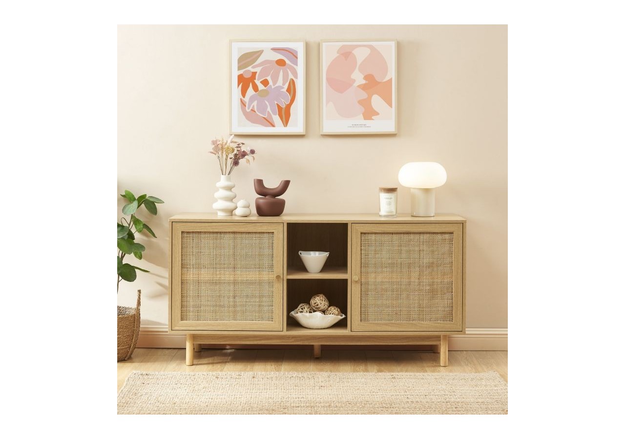 Le plus de ce buffet ? Ses deux portes en cannage rotin, qui apportent une touche d'originalité et de légèreté à l'ensemble. Ce design naturel évoque l'artisanat bohème tout en laissant entrevoir subtilement le contenu des niches de rangement. Les poignées en laiton doré quant à elles, ajoutent une note chic à ce buffet. Le contraste entre le rotin et le laiton doré crée ainsi une esthétique harmonieuse entre la rusticité et l'élégance.