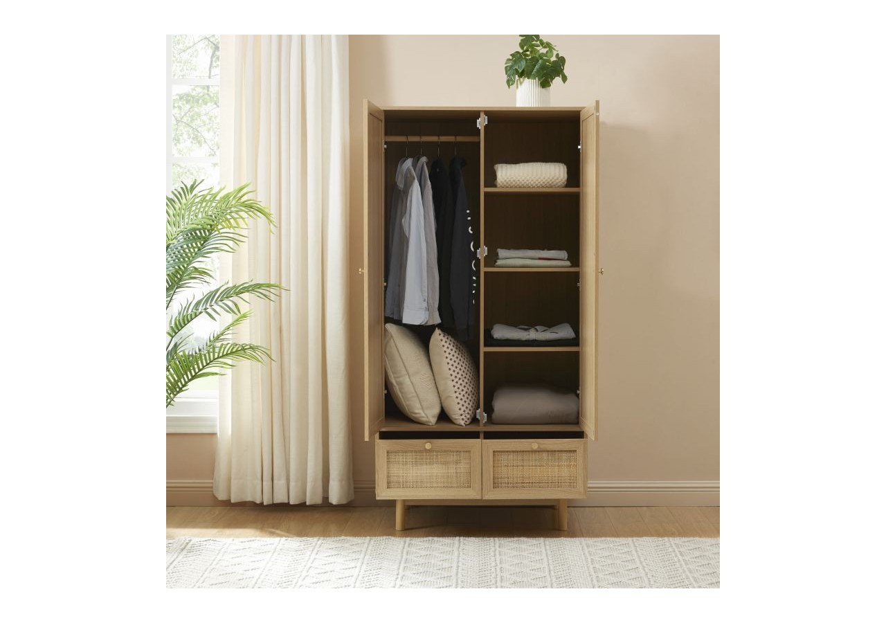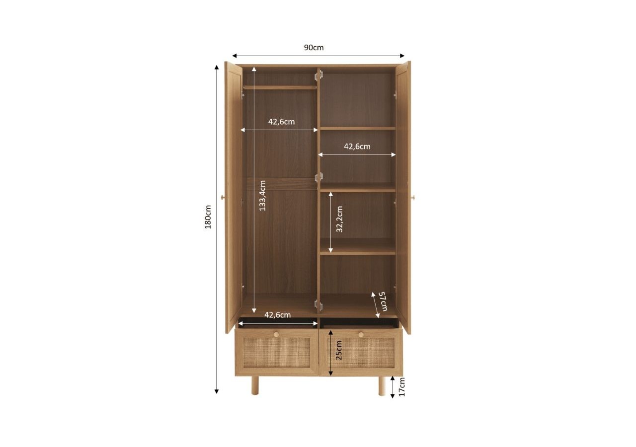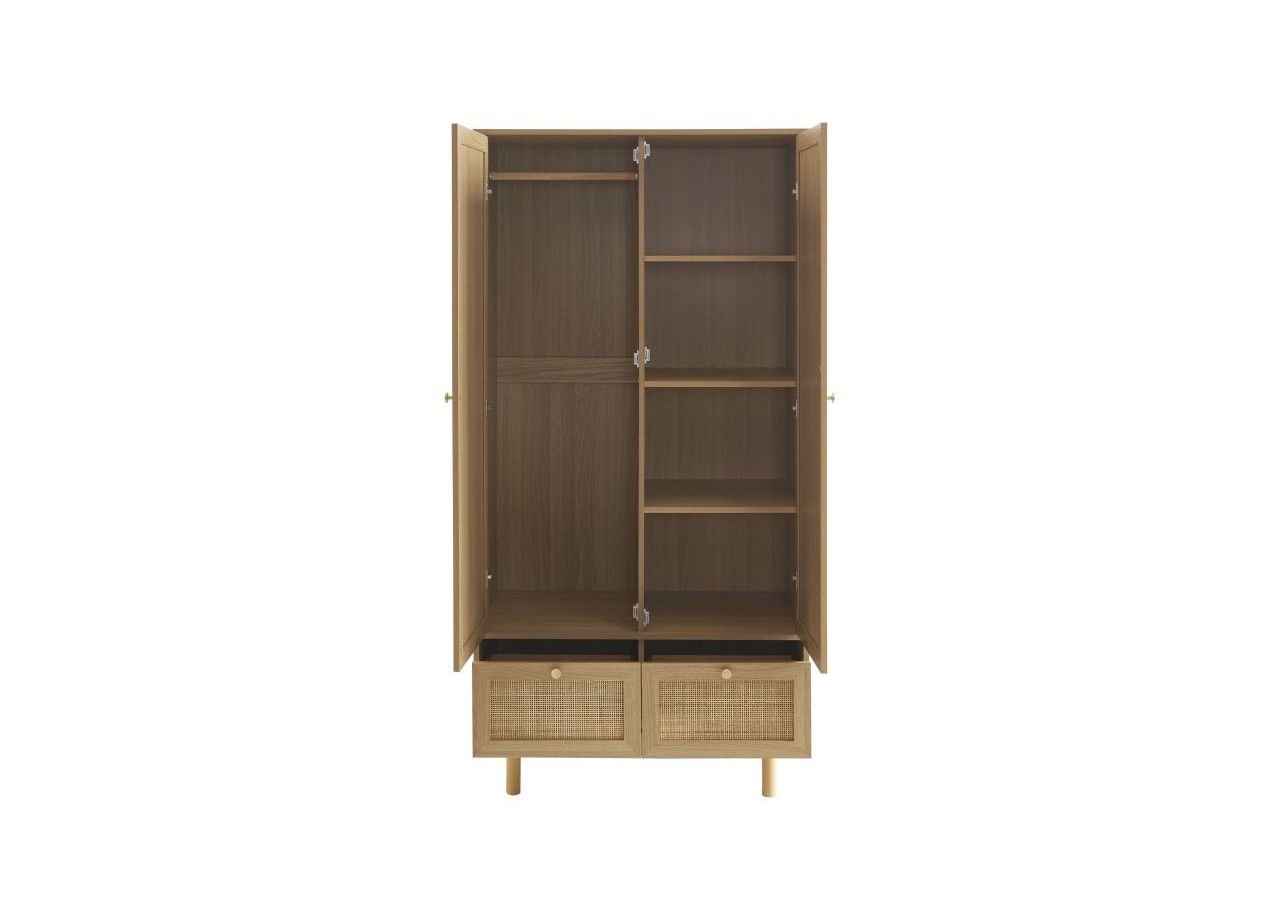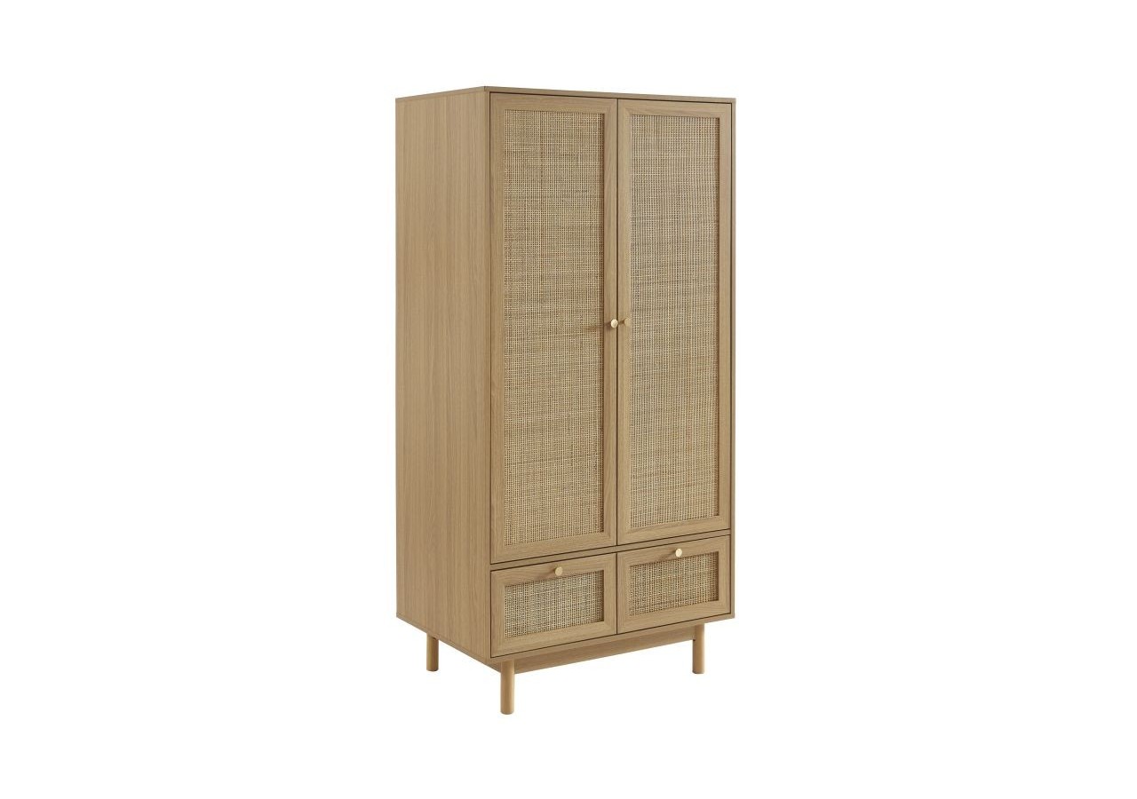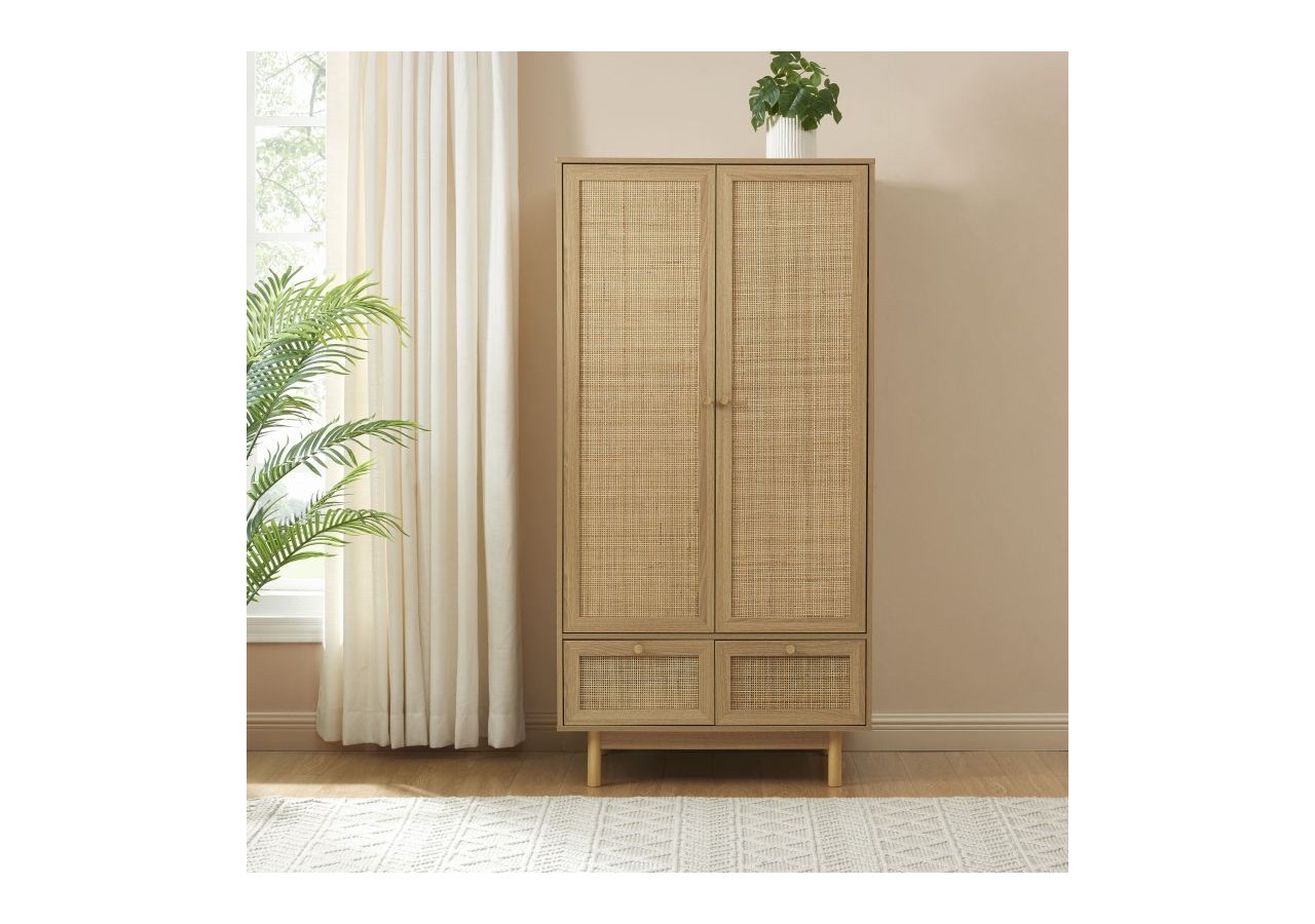 L'armoire en cannage circulaire HELENA apporte une touche naturelle à votre chambre grâce à son cannage et son revêtement effet chêne. À l'intérieur, vous découvrirez un agencement pensé avec soin : un côté penderie spacieux pour accueillir vos vêtements, ainsi que des étagères pour organiser toutes vos affaires. Retrouvez également 2 tiroirs pour encore plus de rangement en bas de votre armoire en cannage.
