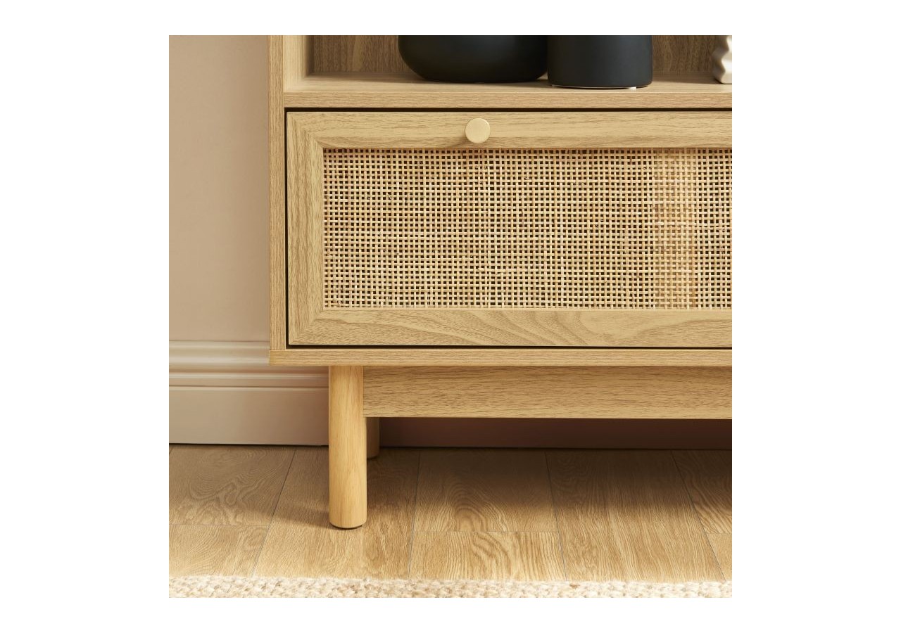 Avec son étagère spacieuse, la bibliothèque en cannage HELENA offre l'espace nécessaire pour exposer vos livres préférés, vos objets de décoration ou encore votre vaisselle. Son revêtement en effet chêne clair apporte de la chaleur à ce meuble, évoquant une ambiance apaisante et accueillante. Le cannage quant à lui, ajoute une texture subtile et naturelle.
