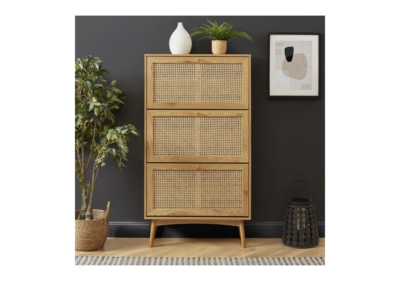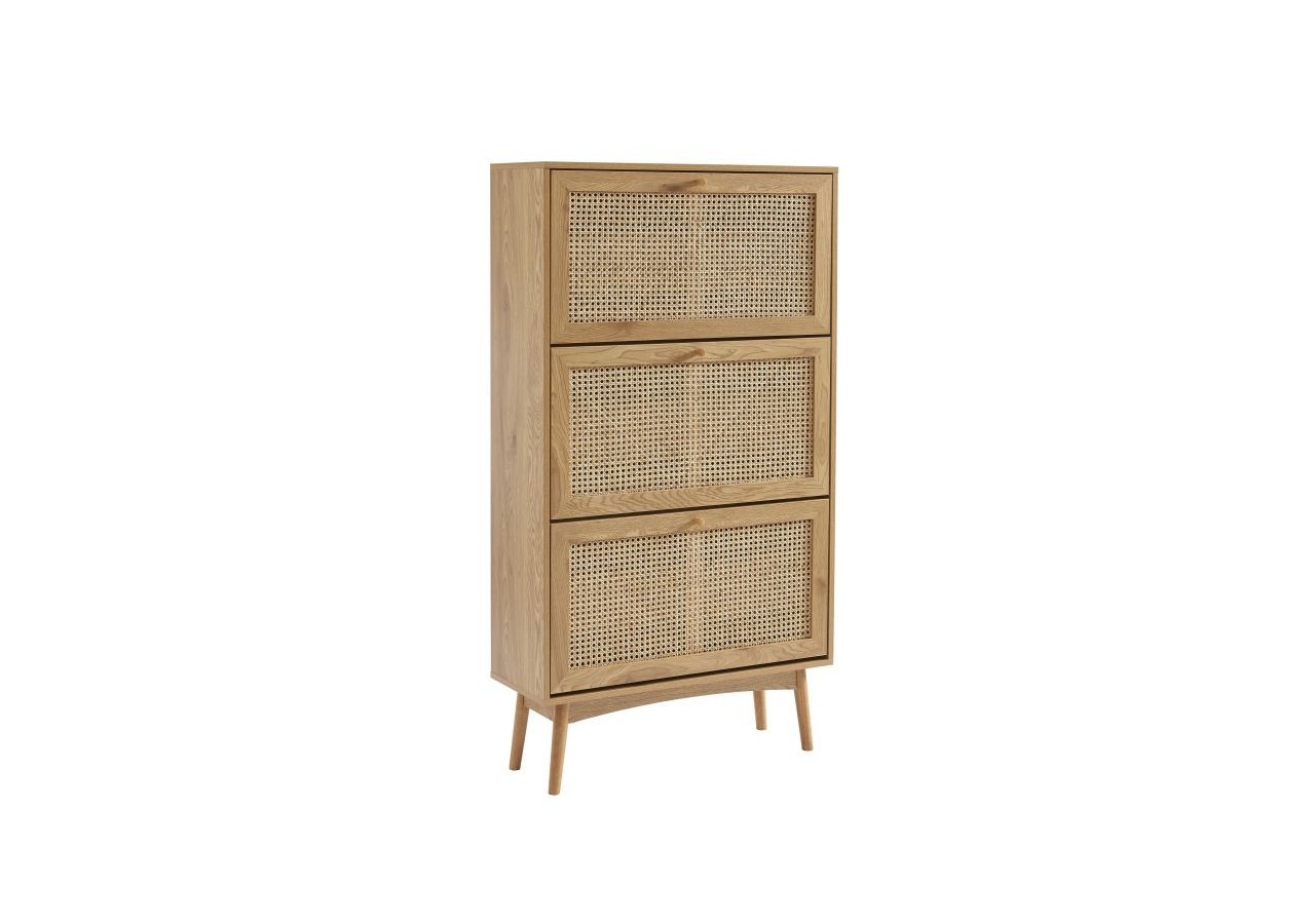 On tombe littéralement sous le charme de ces 3 portes à battants habillées de cannage en rotin circulaire. De plus, son revêtement effet chêne clair et ses poignées en bois massif apportent à ce meuble à chaussures un vrai caractère.