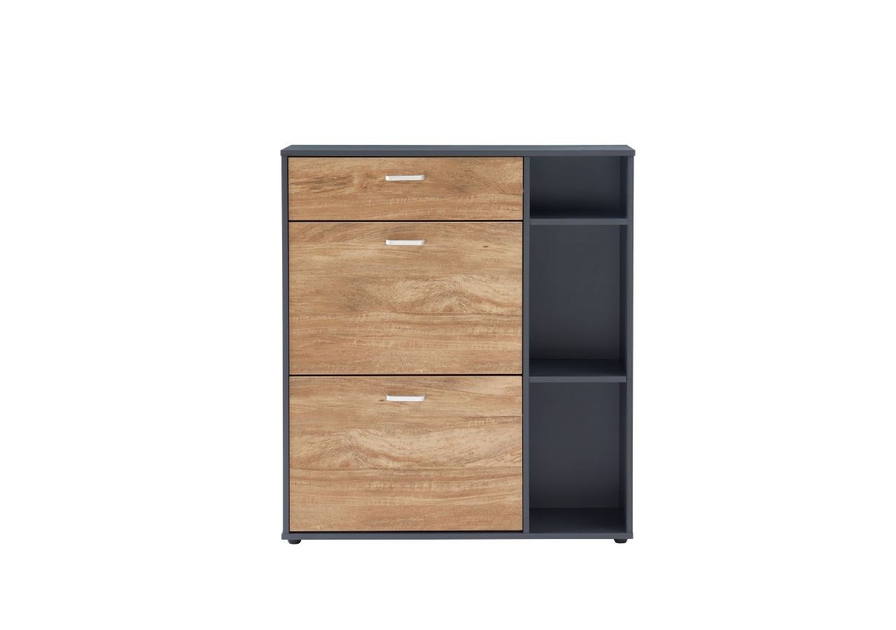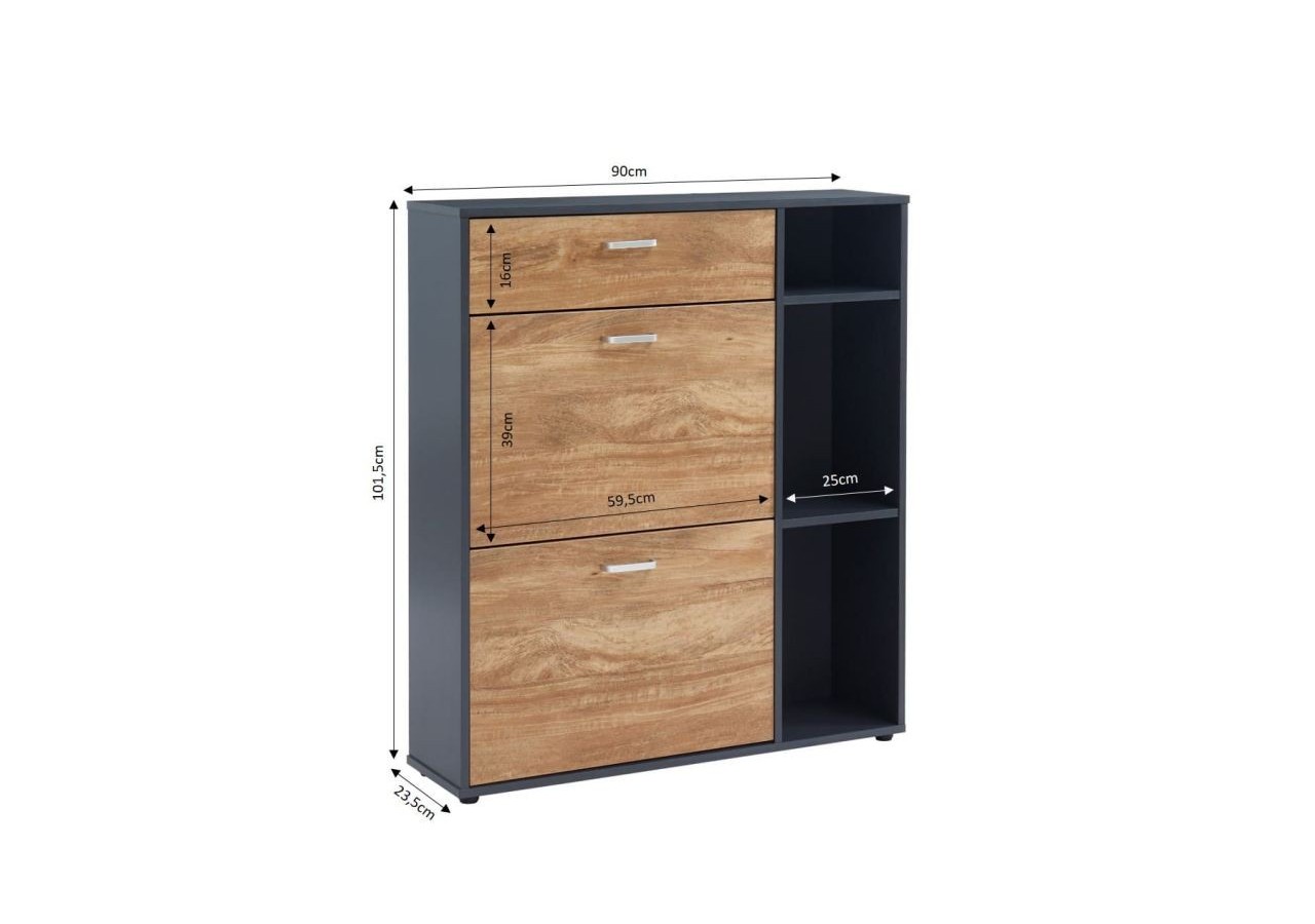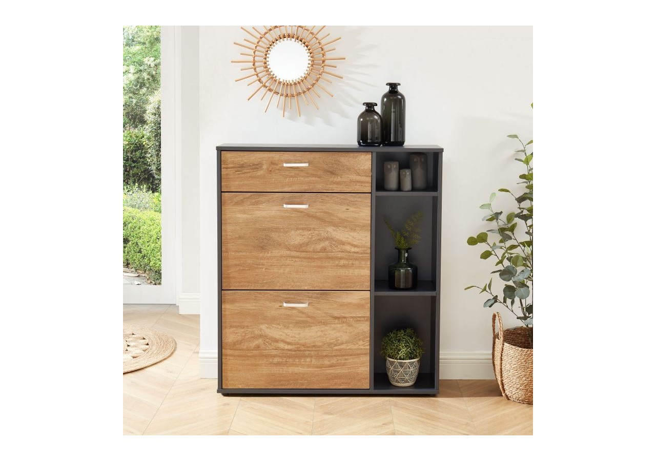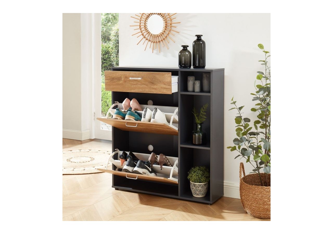 Meuble à chaussures LAZARE - 2 portes, 1 tiroir et 3 niches - structure en panneaux de particules - revêtement en papier décor noir et coloris bois - 4 pieds en MDF - Pouvant contenir entre 8 et 12 paires de chaussures - Dimensions : L90 x P23,5 x H101,5cm - Dimensions tiroir : L59.5 x P20.5 x H16cm - Dimensions portes : L59.5 x P20.5 x H39cm - Dimensions niches : L25.2 x P22 x H16 / 39 cm.