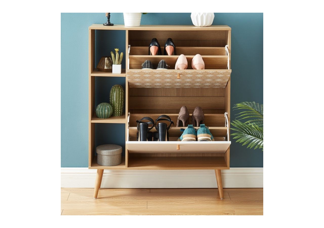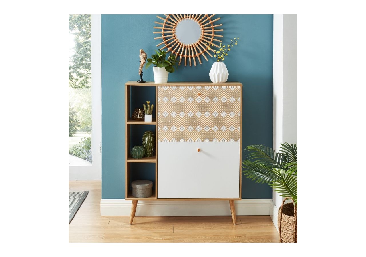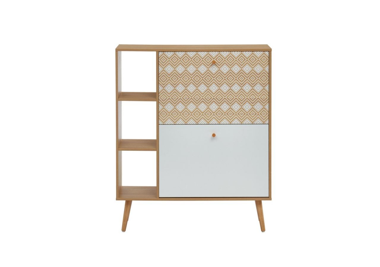Le meuble LEIKA directement inspiré du mobilier nordique vous permettra de ranger vos chaussures mais pas que...Constitué de 2 portes basculantes, dont 1 blanche et 1 à motifs losanges blancs, et de 3 niches de rangement latérales, le meuble LEIKA saura aussi sublimer votre entrée avec sa jolie combinaison de couleur, ses pieds obliques en bois massif et son design épuré. Rangez jusqu'à 12 paires de chaussures soit 6 par compartiment.
