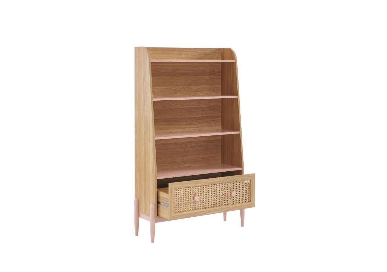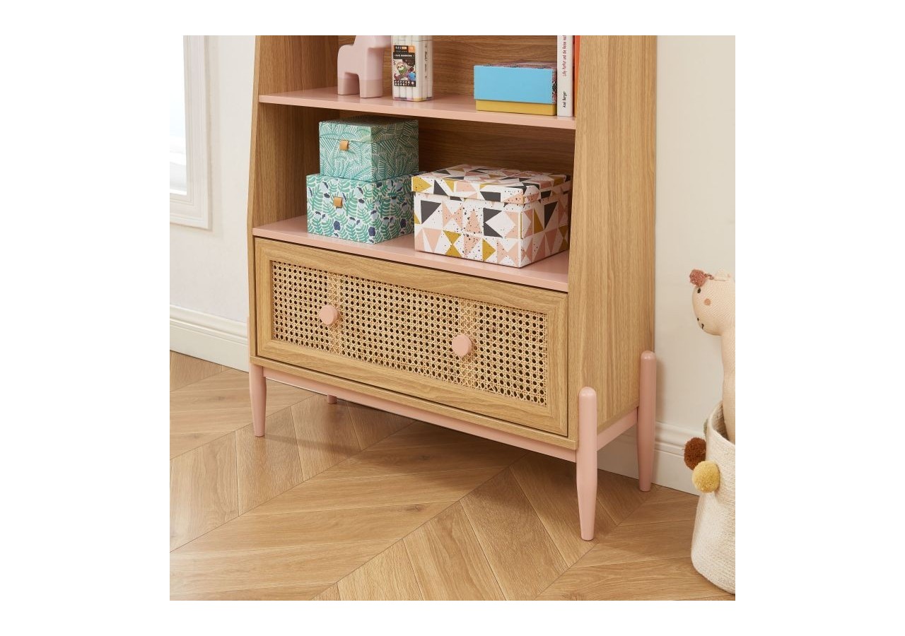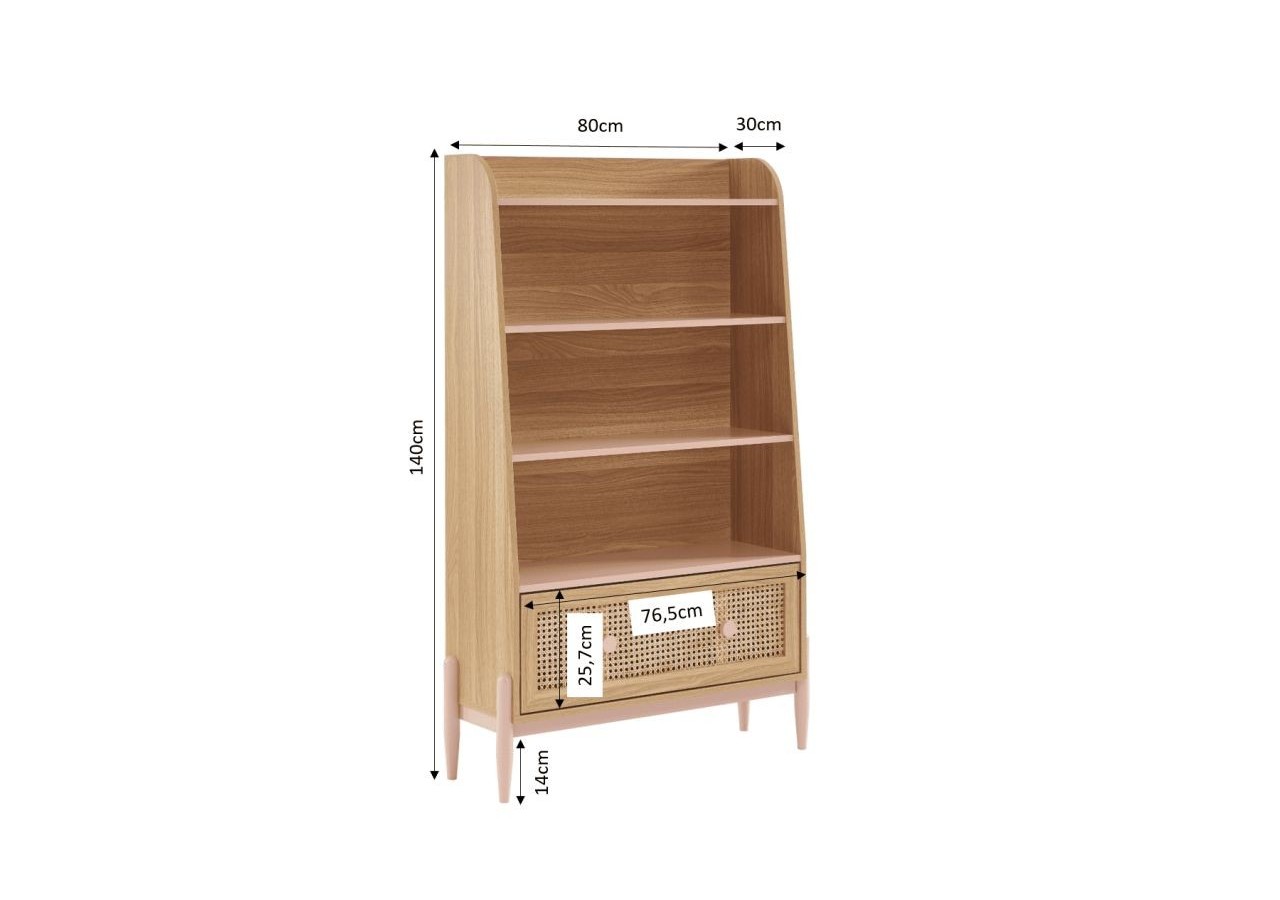 - 3 étagères roses - 1 tiroir avec habillage en cannage véritable - Poignées en bois naturel - 4 pieds en bois massif - Dimensions du produit : L80 x P30 x H140cmLivraison :