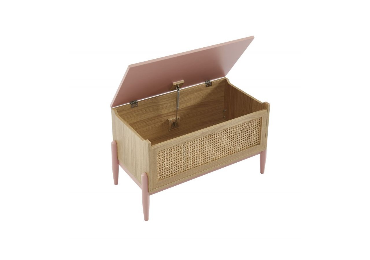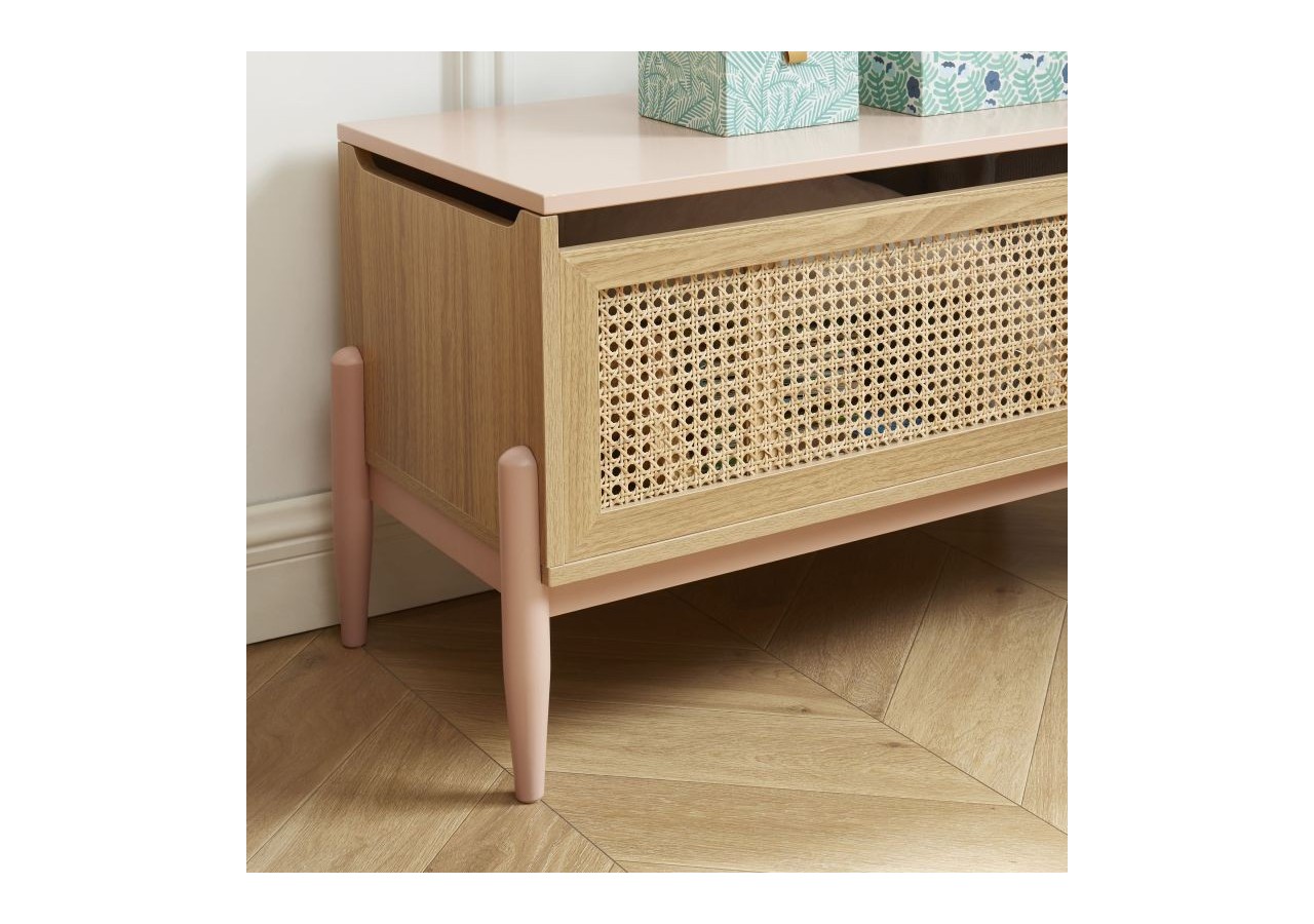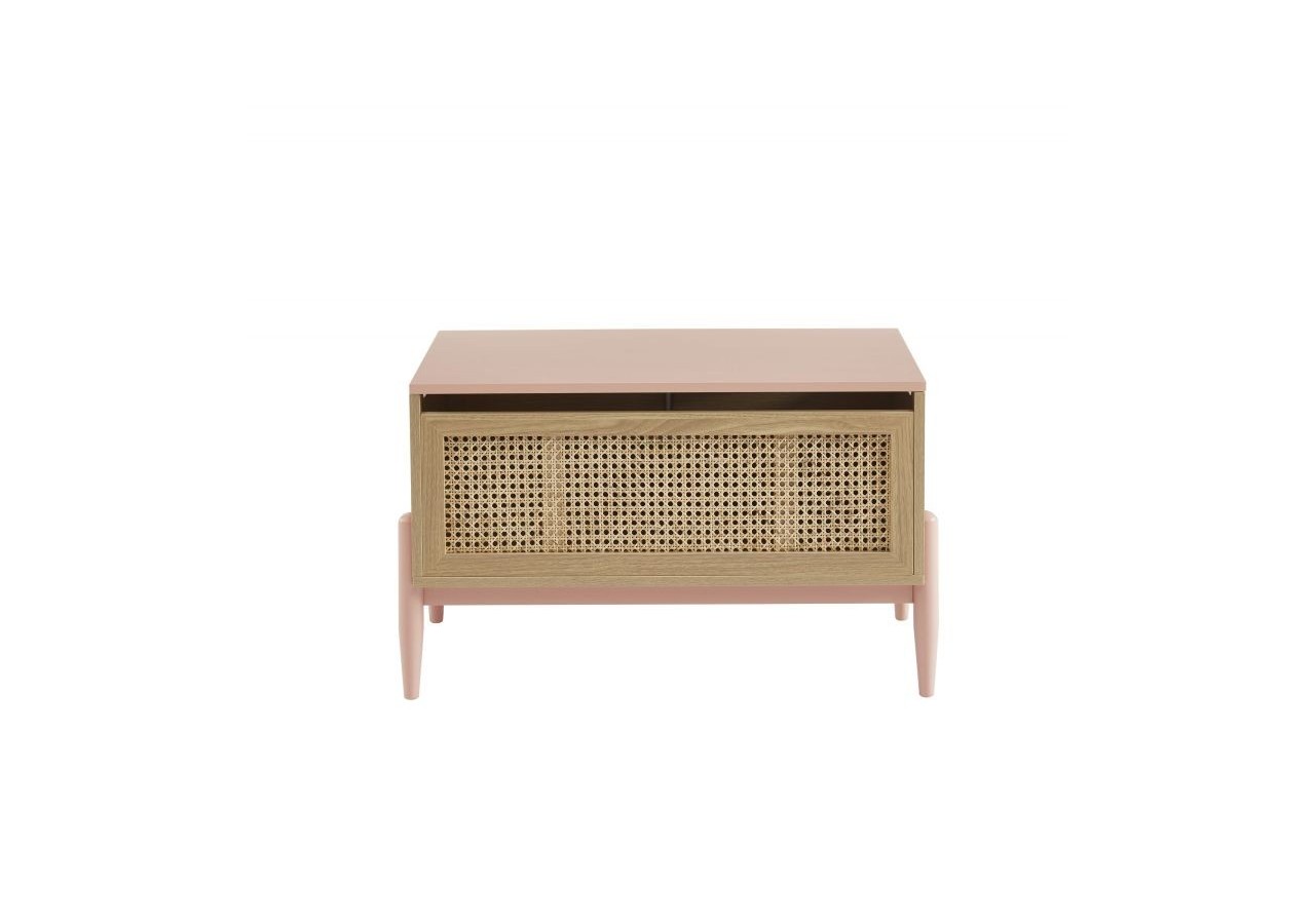 On tombe sous le charme de son tiroir avec habillage en cannage naturel et de ses pieds en bois massif coloris rose.