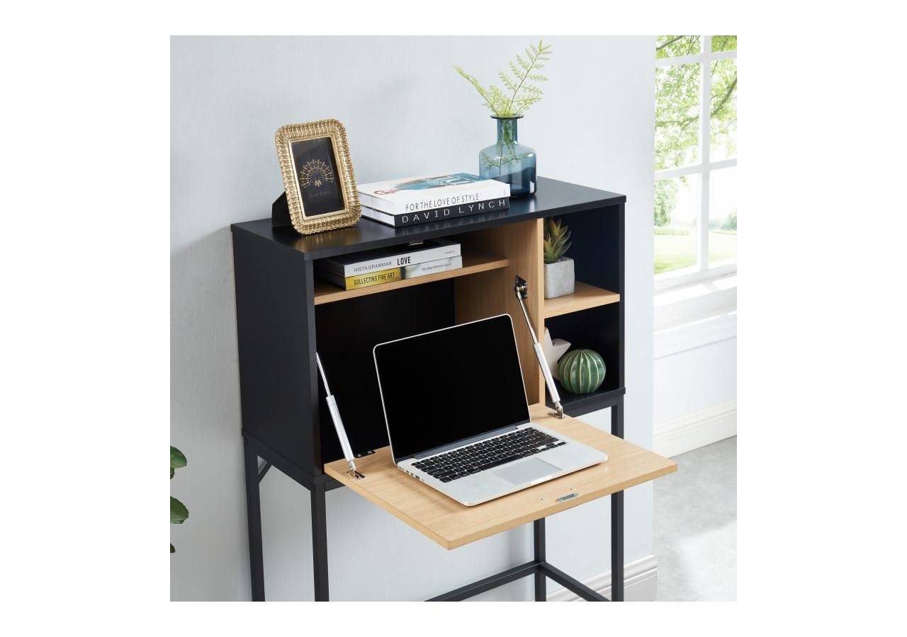 Avec son association des coloris bois et noir ainsi que du métal, le secrétaire Smart revisite complètement l'esprit secrétaire d'autrefois dans un style plus actuel et industriel. Le bureau Smart possède un plateau rabattable qui dévoile un compartiment de rangement dotés d'une étagère ultra-pratique en plus de deux niches visibles sur la droite du secrétaire.