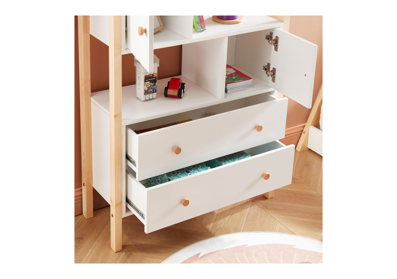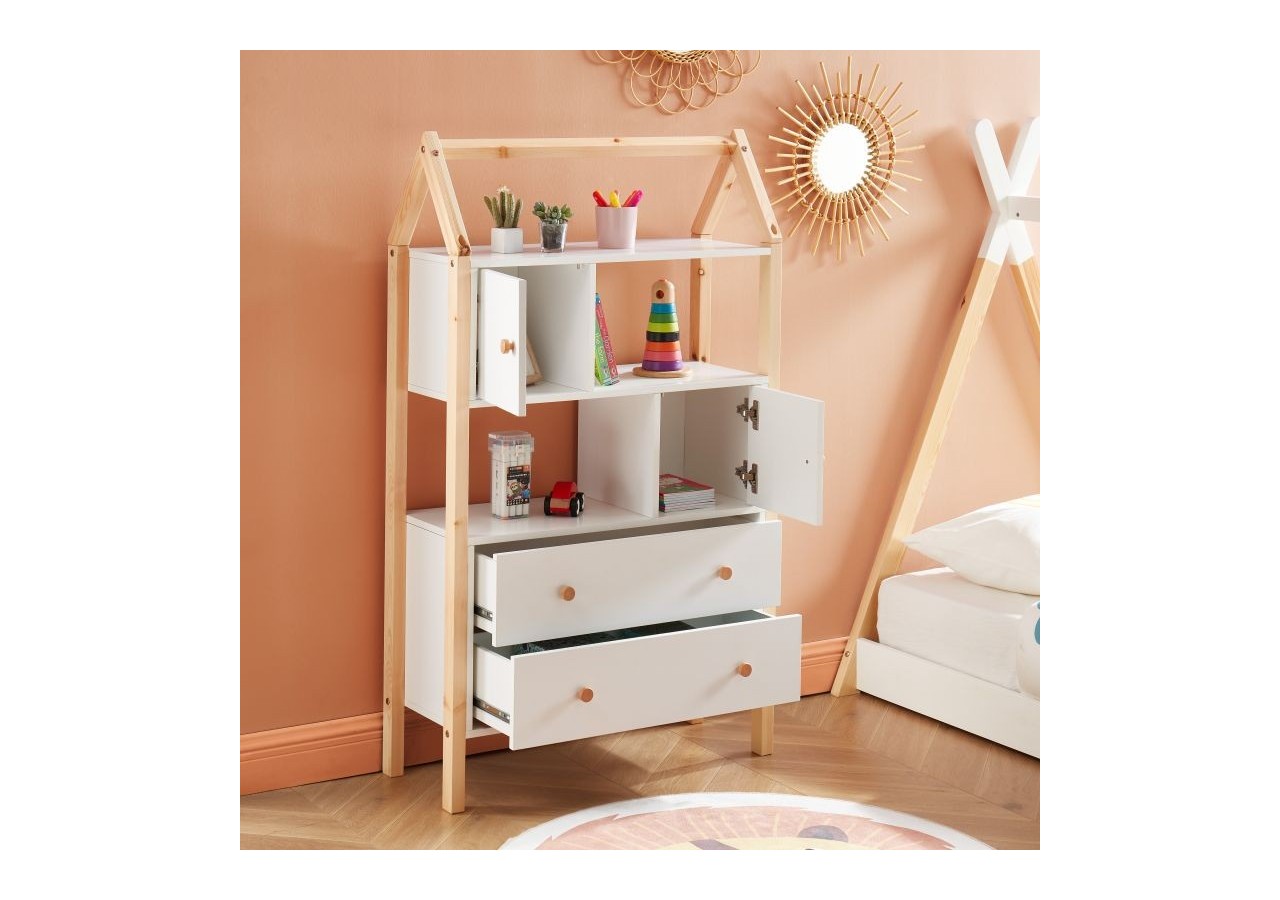 Partez à l'aventure avec la commode TINY ! Avec sa structure en bois massif, c'est à la fois une commode de rangement robuste et un atout charme pour la chambre de votre enfant. De plus, les 2 portes et les 2 tiroirs vous permettront d'y ranger facilement le linge et les 2 étagères pour y mettre de la décoration, des photos ou des peluches