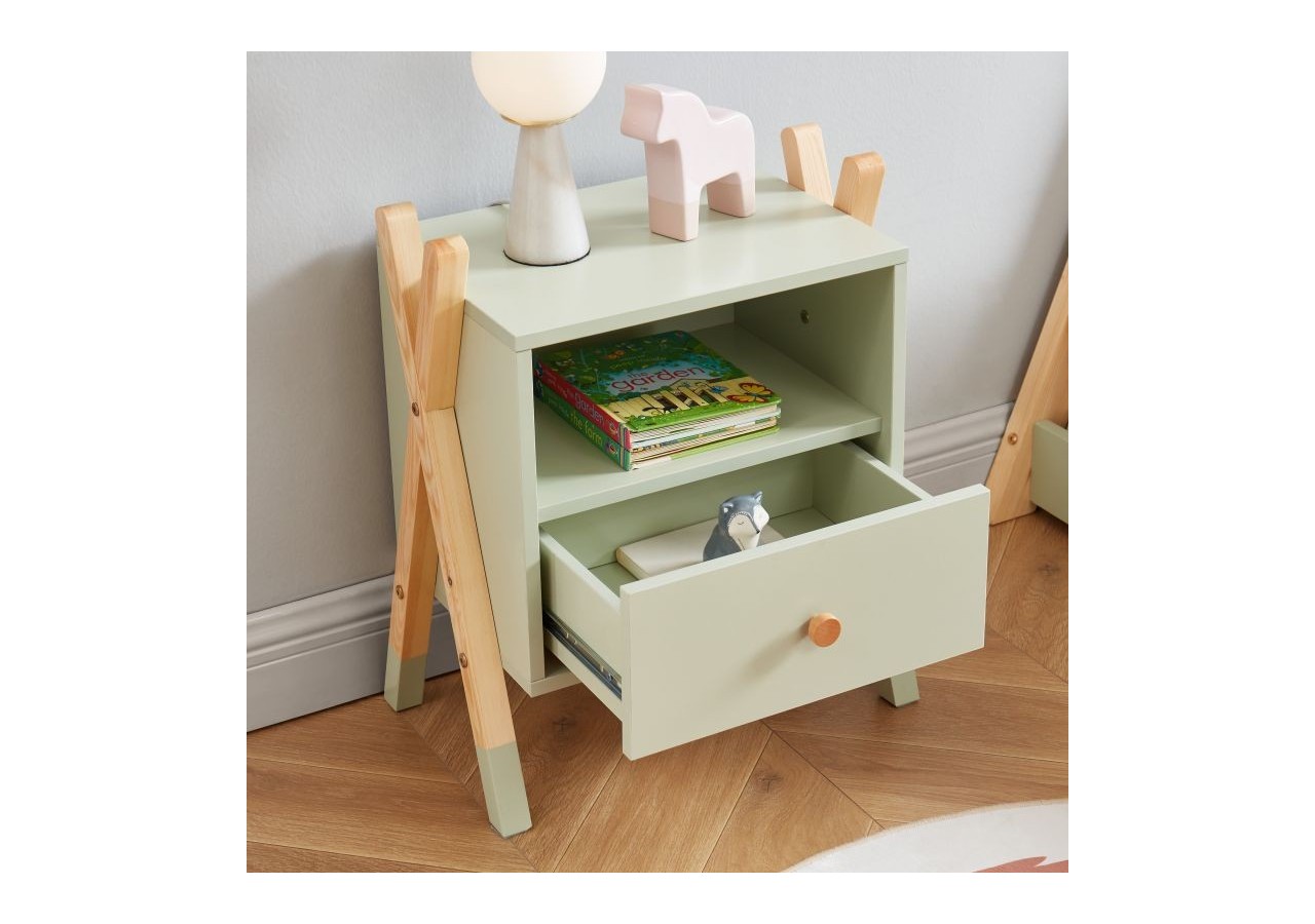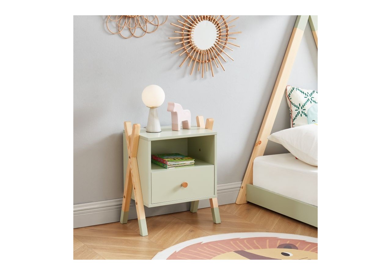 Table de chevet enfant TIPI vert - Structure en panneaux de particules et bois massif - Revêtement mélaminé - 1 tiroir - Dimensions : L46 x P30 x H55cm