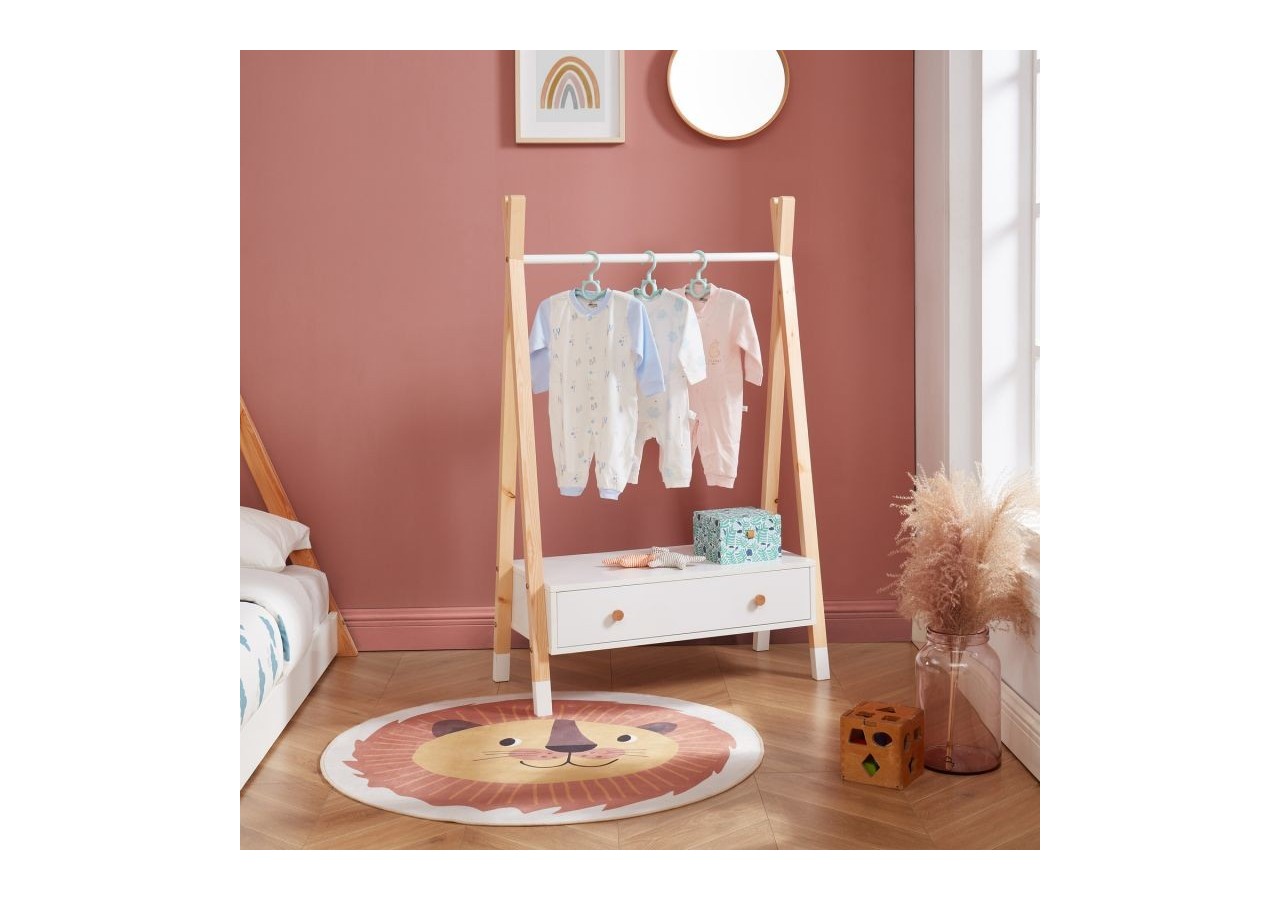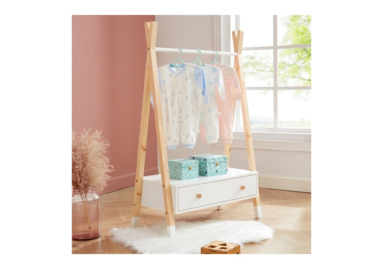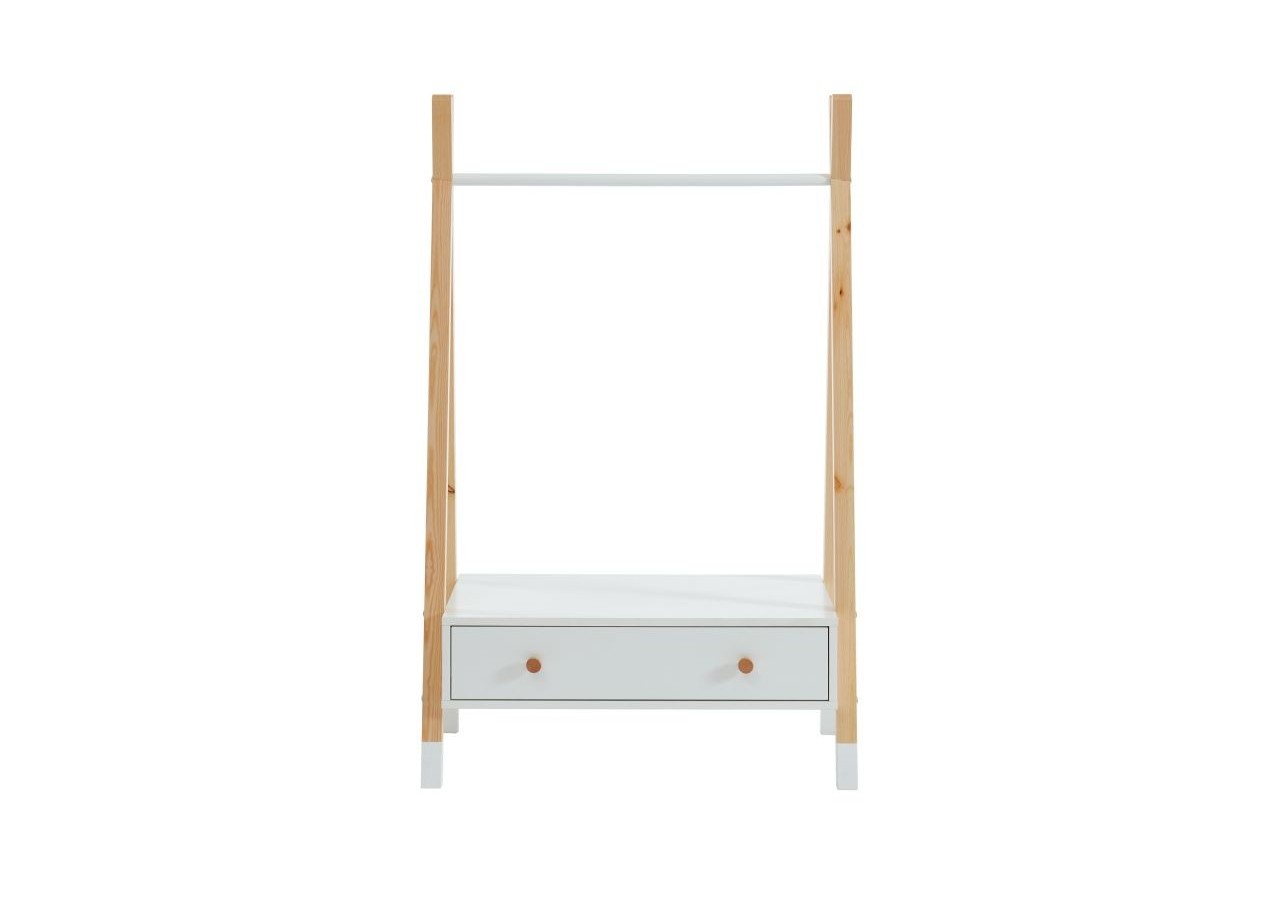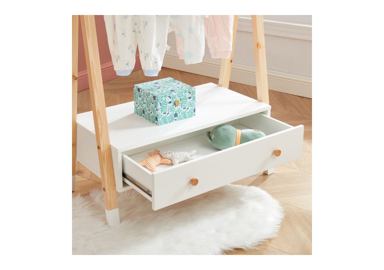 Portant enfant TIPI - Structure en bois massif et en panneaux de particules - Revêtement mélaminé blanc - 1 tiroir de rangement - Dimensions : L80x P40 x H130cm