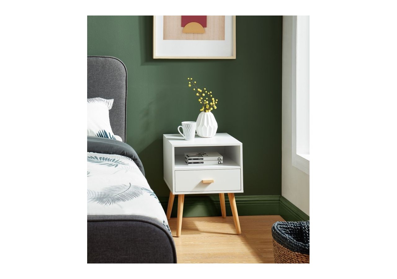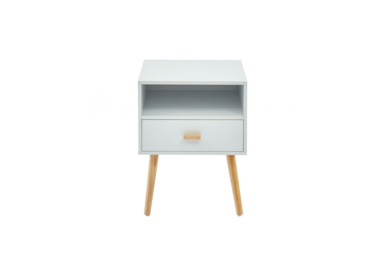 Table de chevet ULOS - Structure en panneaux de particules - Revêtement en papier décor blanc - 1 tiroir de rangement - Pieds en bois massif de pin - Dimensions : L40 x P39,5 x H50cm
