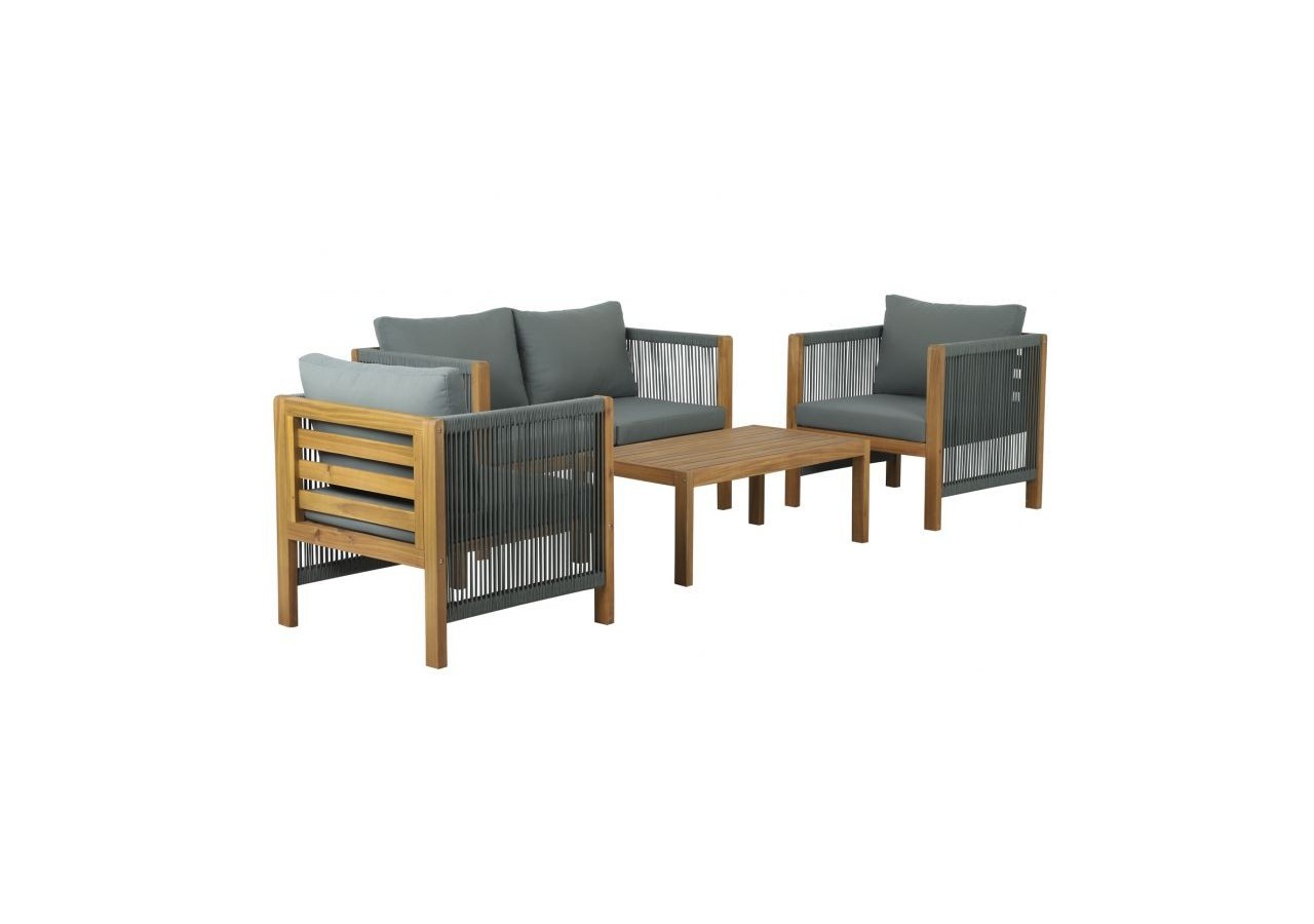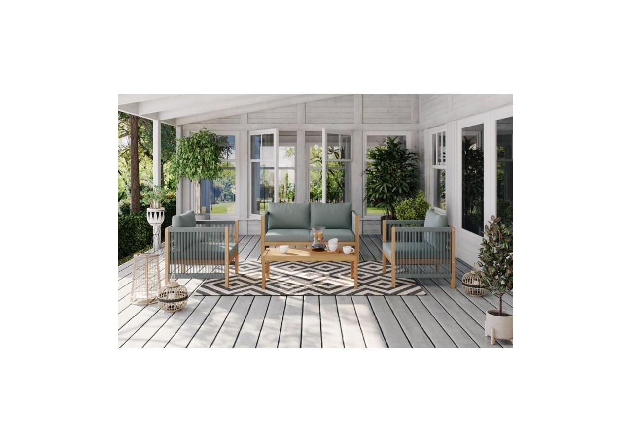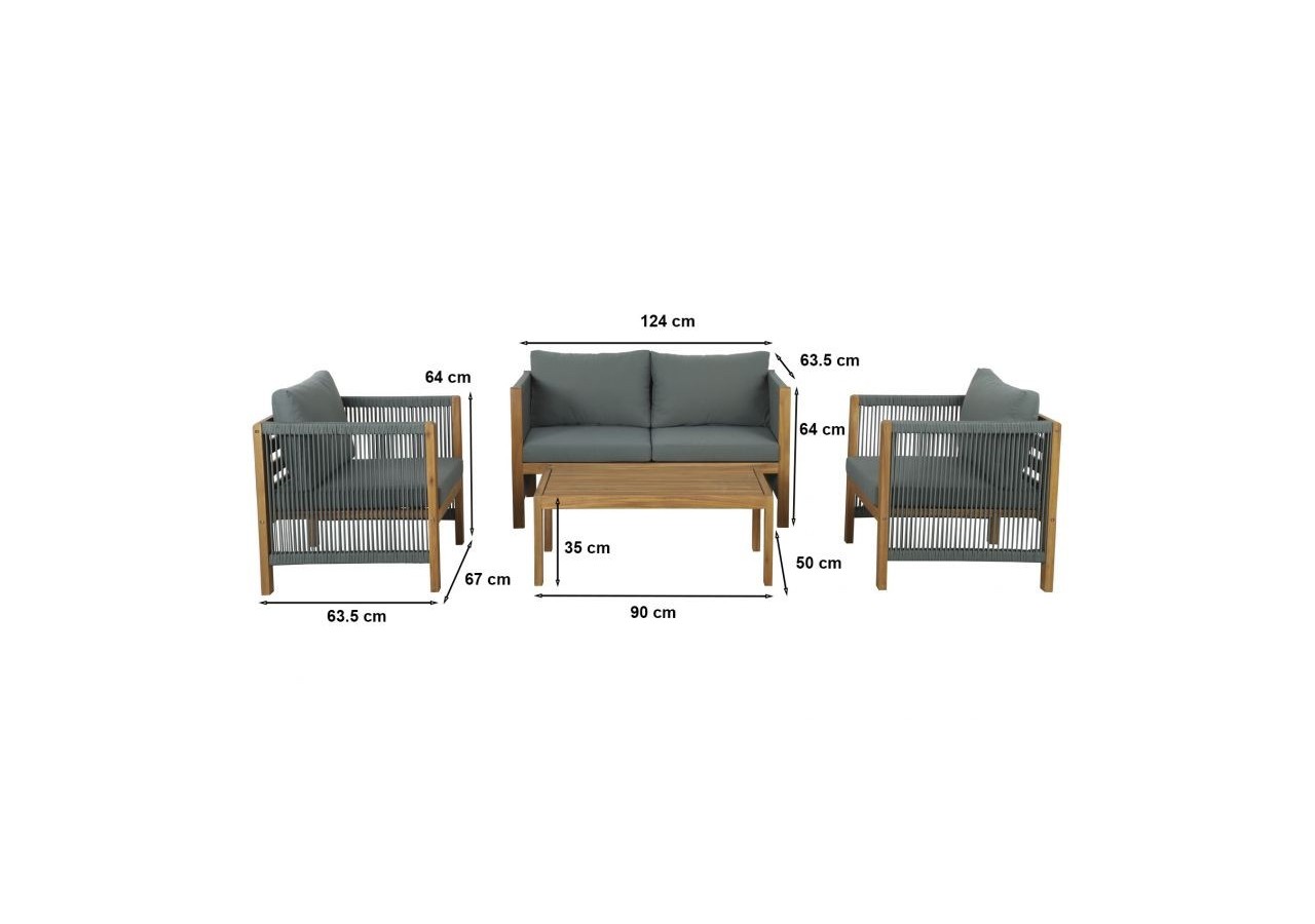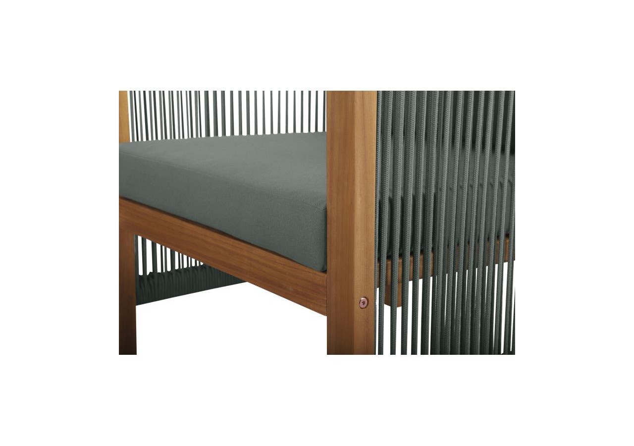 La structure se compose de 2 éléments : de corde et de bois d’acacia FSC pour un salon robuste et tendance. Résistant à l’humidité, au soleil, aux écarts de température, l’entretien se veut rapide et facile. L’ensemble est accompagné de 4 coussins d’assises ( 2 pour la banquette + 2 pour les fauteuils) et de 4 coussins de dossier en polyspun 230 gr déperlant, adaptés pour l’extérieur.