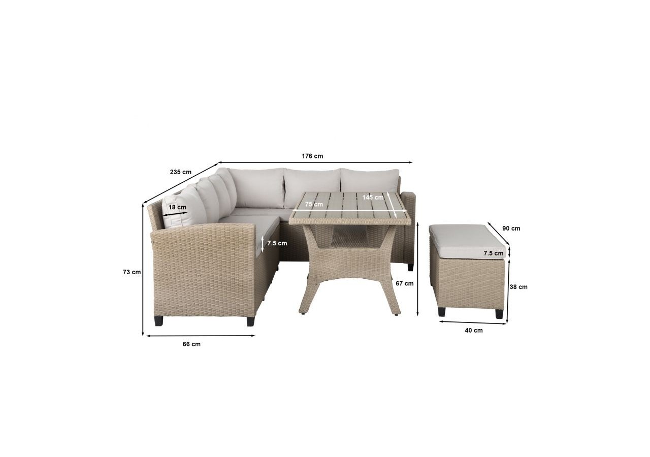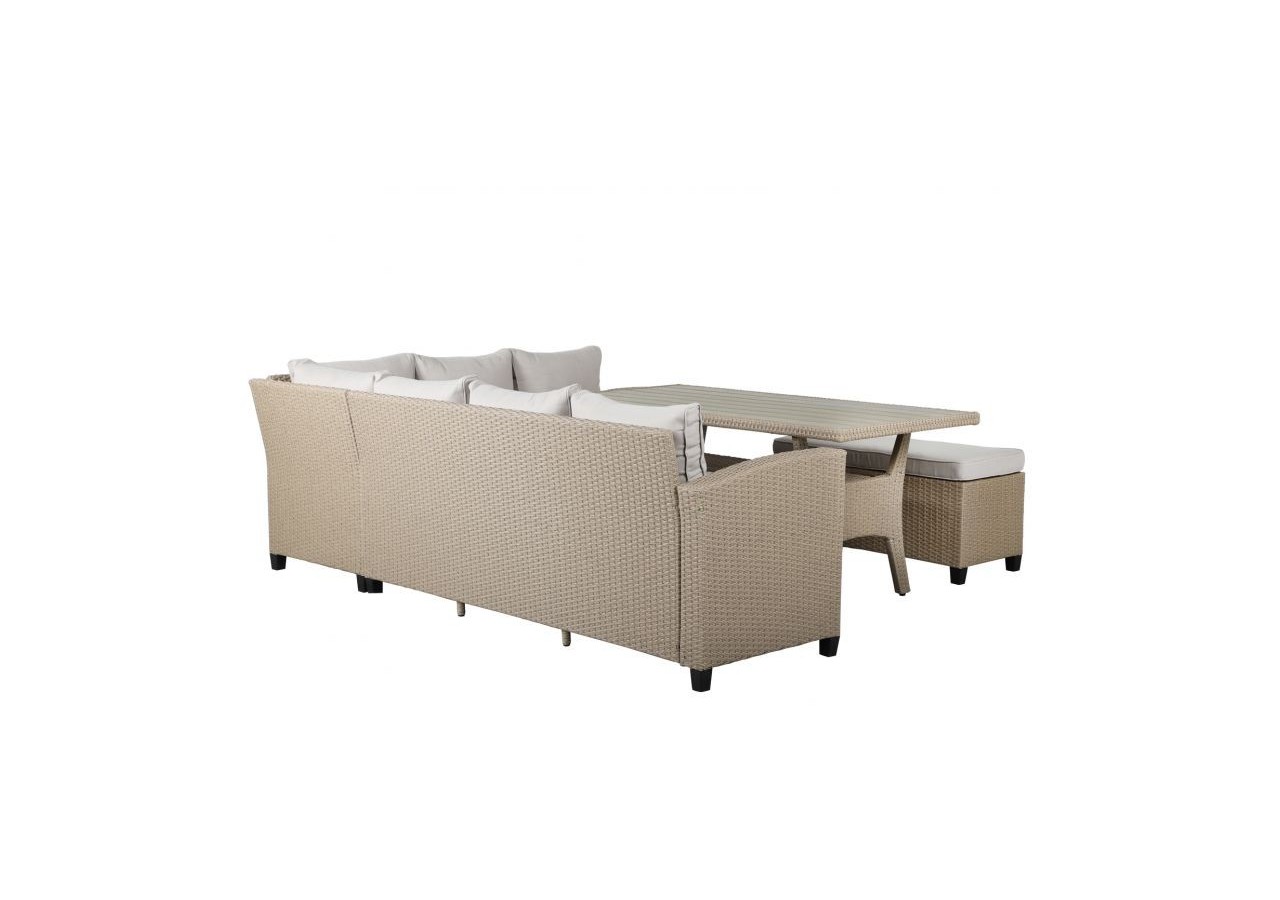 Sa table haute lui donne une fonction de table à manger et son canapé d'angle en fait également un salon de jardin cosy et tendance.