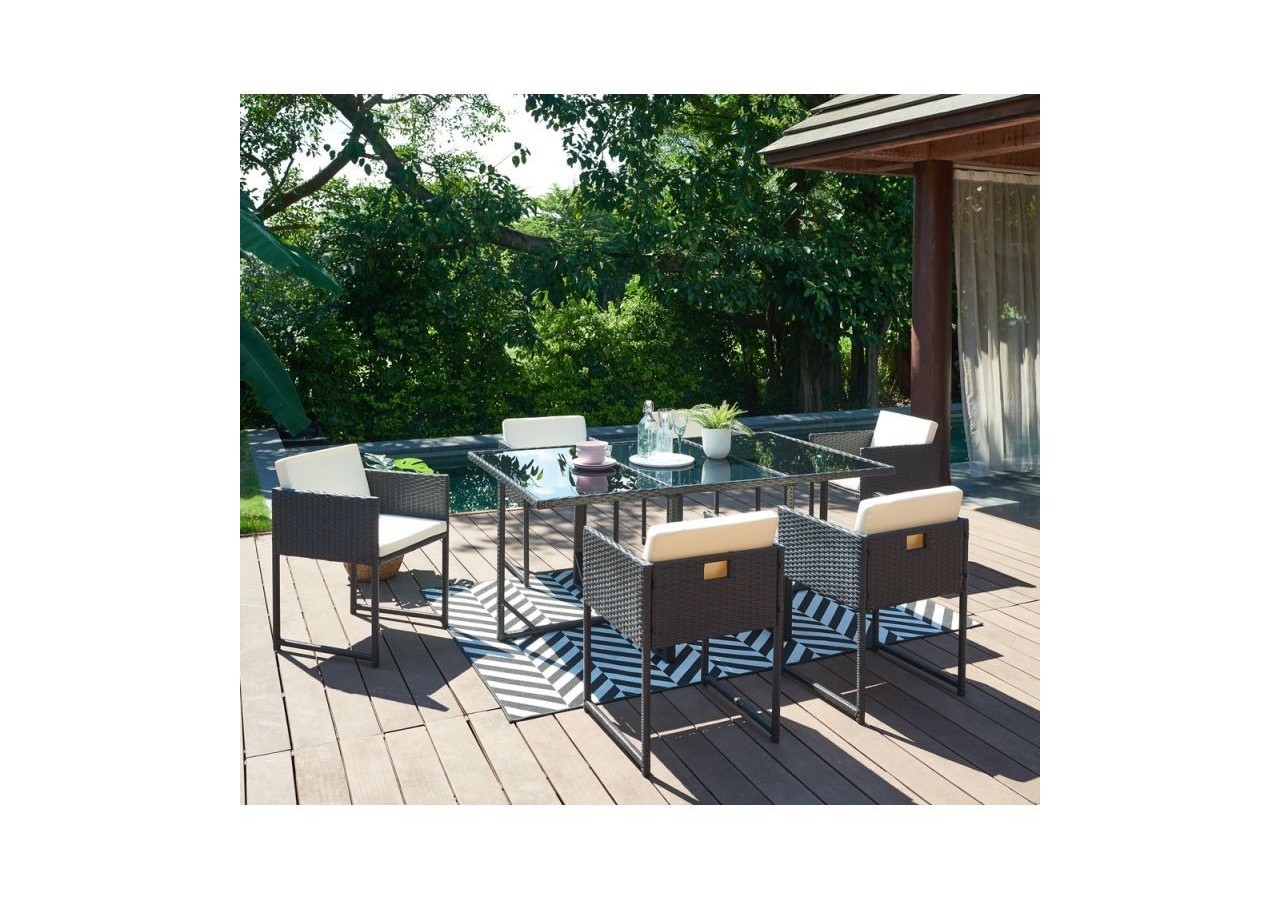 Optez pour l'ensemble repas 6 places FLORIDA pour aménager votre terrasse et recevoir amis et convives lors de la période estivales. Le mélange acier et résine tressée apporte une touche contemporaine à l'ensemble. Les chaises sont encastrables, ce qui rend l'ensemble de jardin pratique et compact lors du rangement.