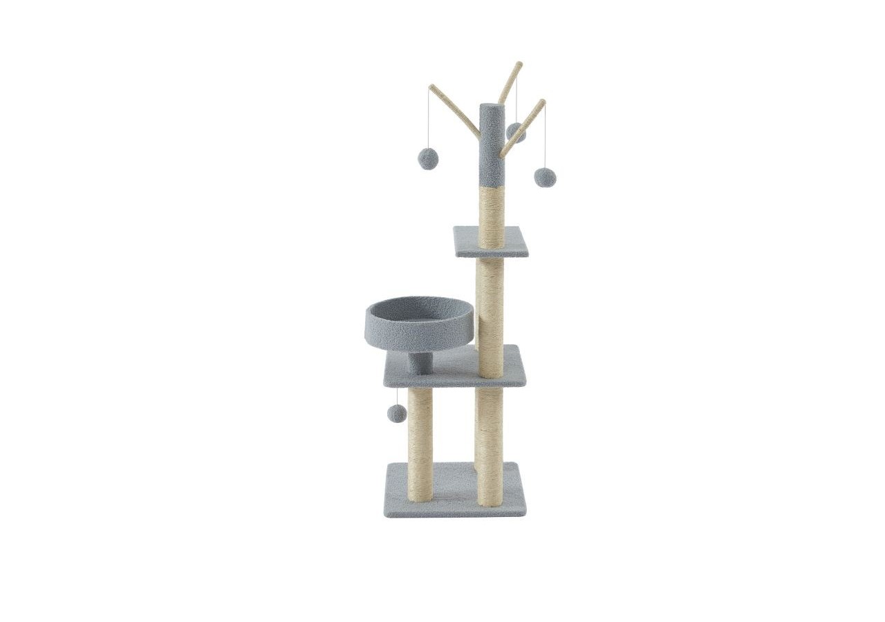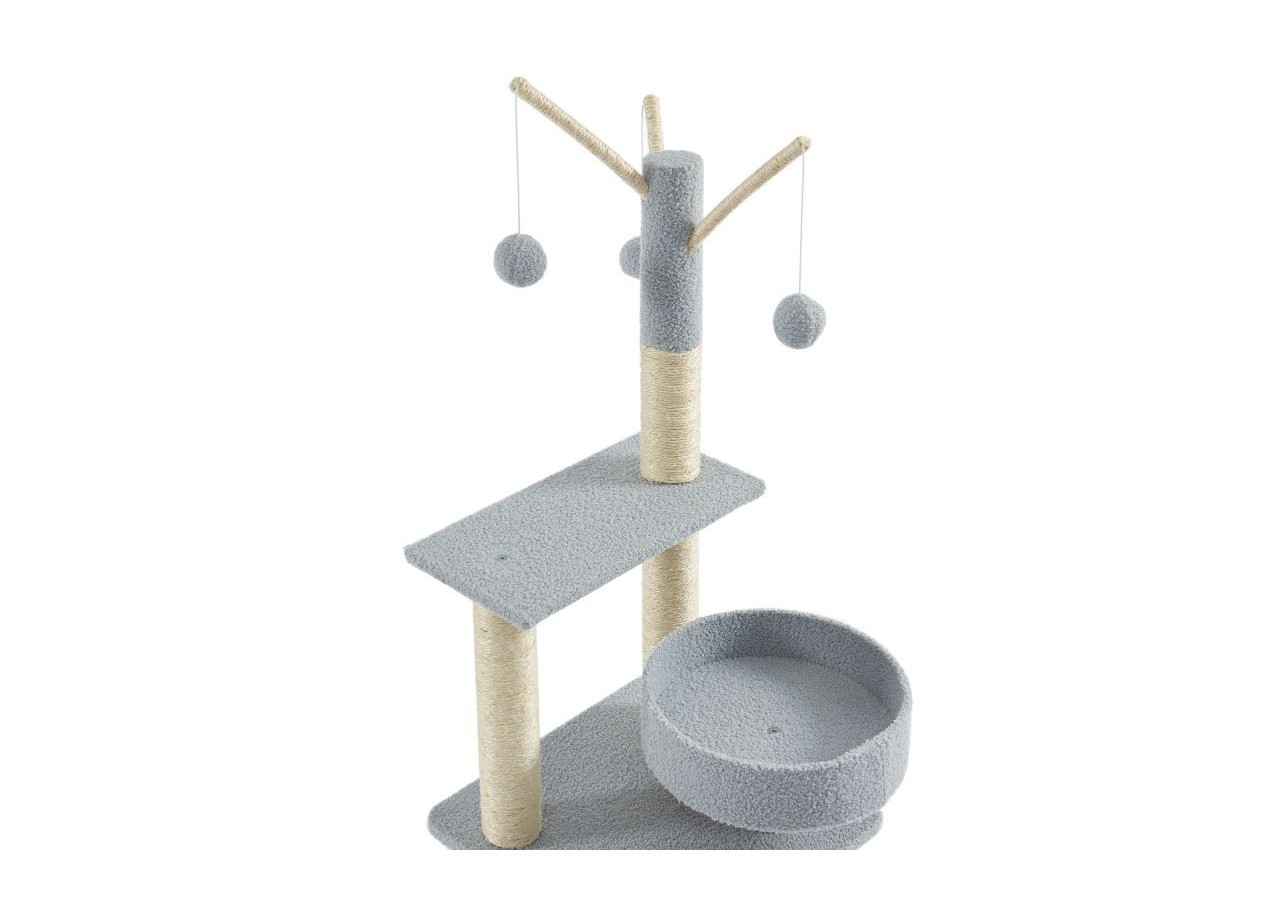 Cet arbre propose de nombreuses possibilités de jeux : un nid de repos à mi hauteur, un étage pour jouer avec 3 pompons suspendu, ainsi que des poteaux en sisal pour faire les griffes.