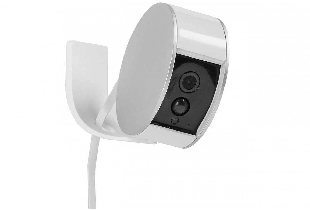 Support mural discret et élégant pour accrocher la caméra de survellance Somfy Indoor Camera en hauteur, directement sur un mur.
