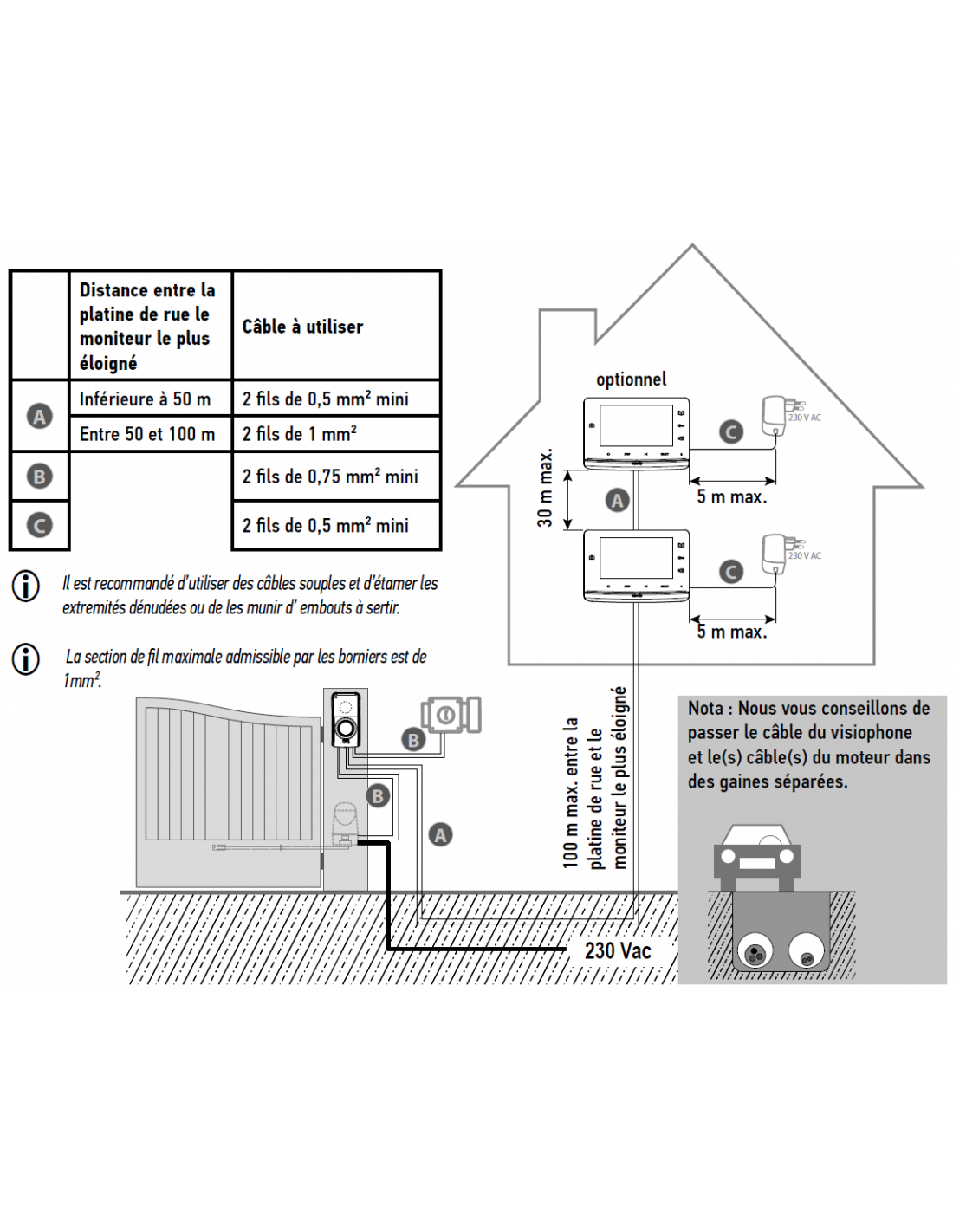 La platine de rue peut être reliée à une motorisation de portail et à une gâche/serrure électrique (12 V AC/DC - 800 mA maximum).