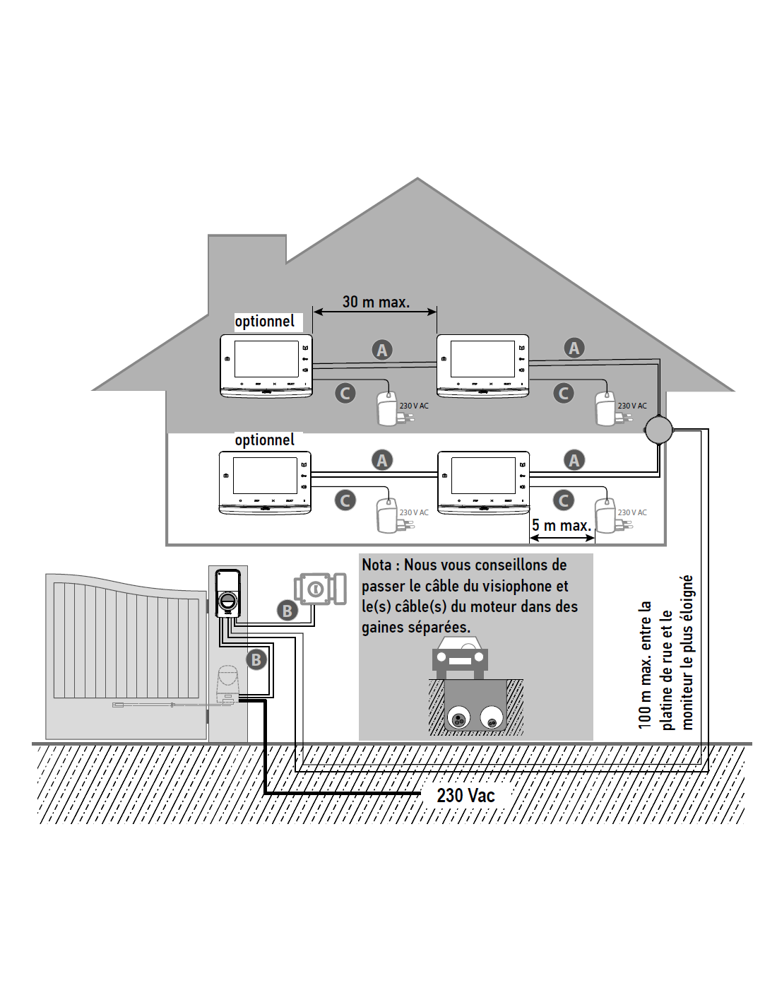 Le visiophone V300 est composé d'un moniyeur intérieur ainsi que d'une platine de rue. Le raccordement entre les deux éléments s’effectue avec 2 fils et le bloc d’alimentation secteur se câble sur le moniteur.
