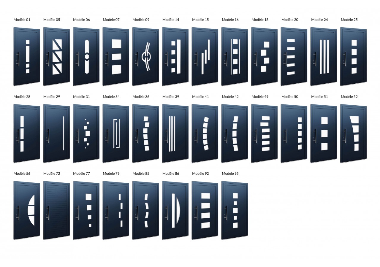 Gamme de porte en aluminium au design moderne avec un large choix de motifs et coloris disponibles pour concevoir votre porte d'entrée en aluminium sur mesure.