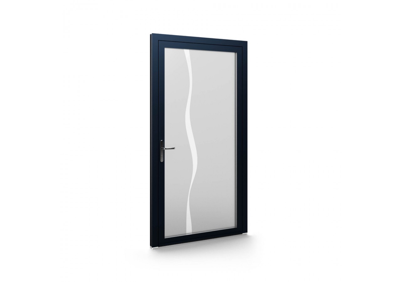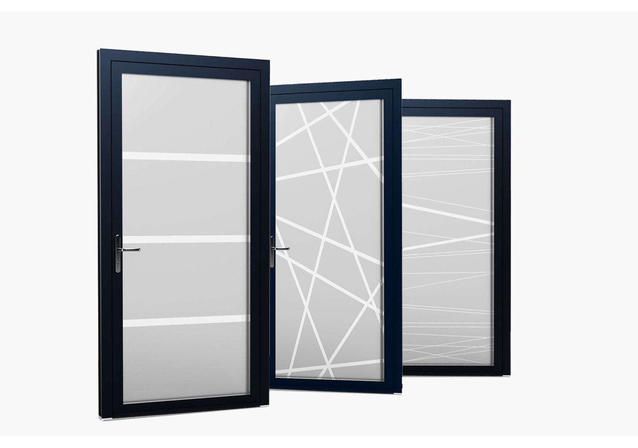 Gamme de portes vitrées à haute efficacité énergétique. Les panneaux sont constitués de deux feuilles de verre VSG, dont l'une a des motifs sablés.