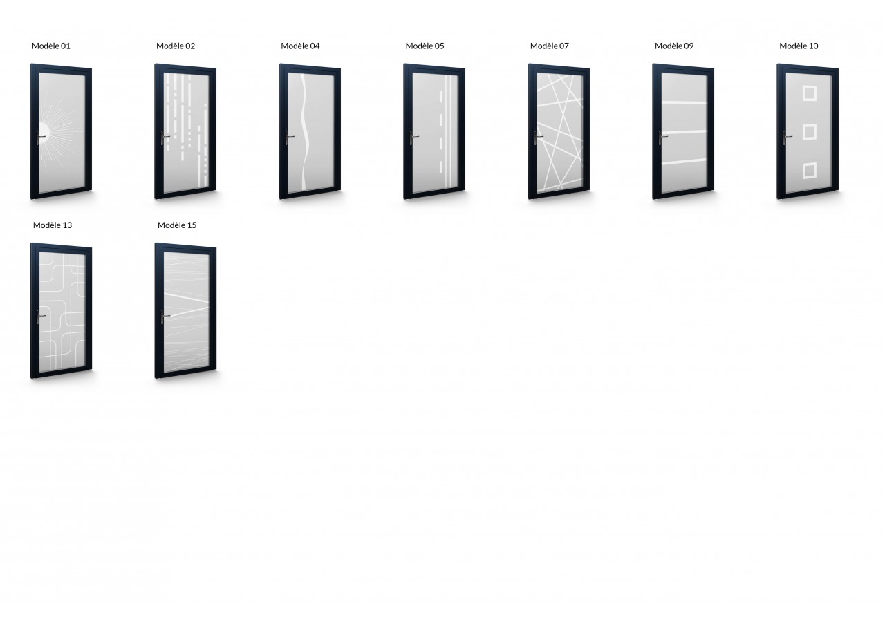 Gamme de portes vitrées à haute efficacité énergétique. Les panneaux sont constitués de deux feuilles de verre VSG, dont l'une a des motifs sablés.