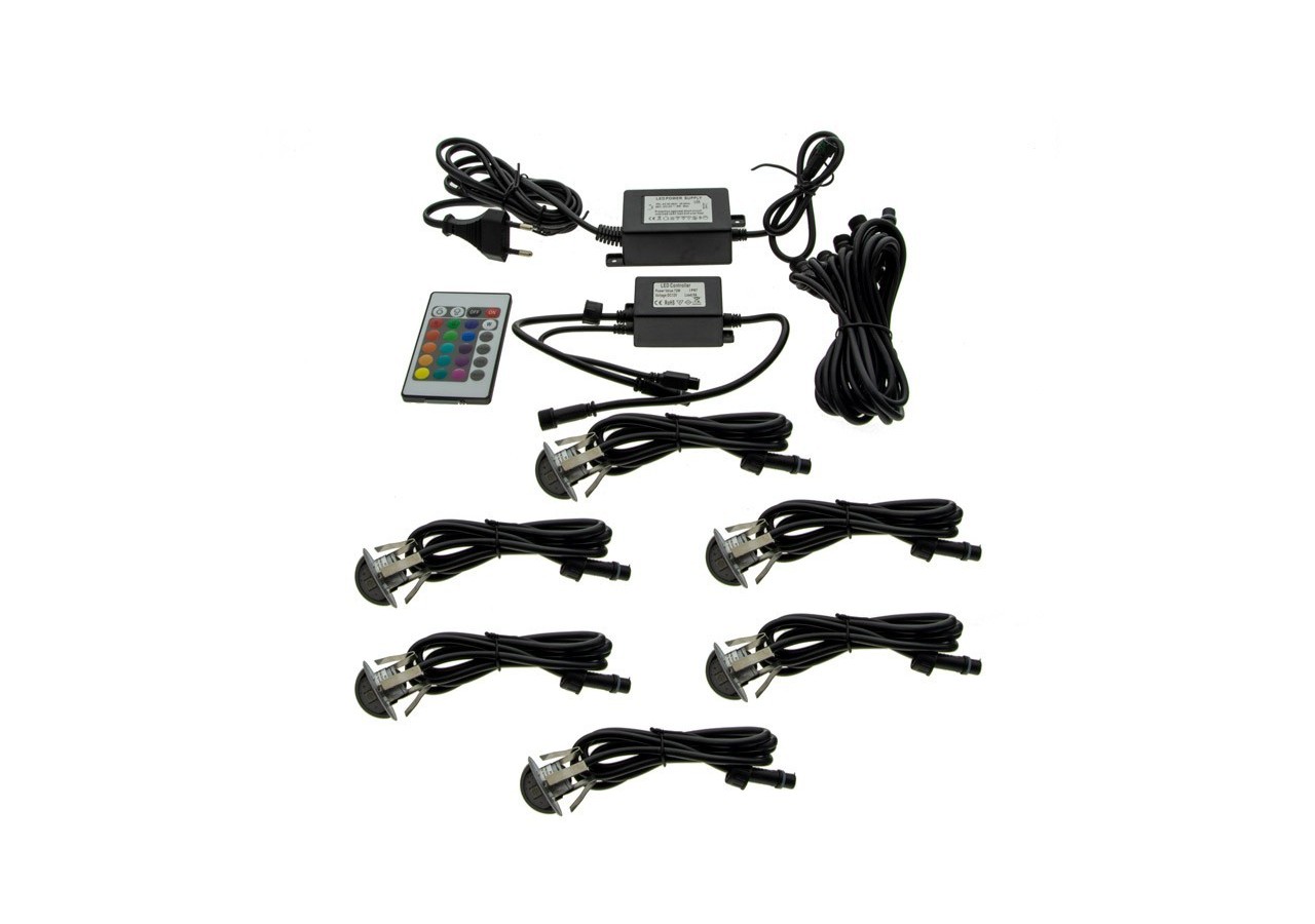 Le Kit se compose de6spots LED d'escaliers, d'un transformateur de 8W, le programmateur RGB avec télécommande et de câble IP67