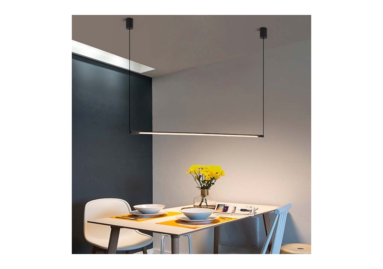 Grâce à son design simple aux lignes droites et à sa couleur noire, ce luminaire s'adapte à tout environnement moderne minimaliste en apportant distinction et sobriété. Il se distingue particulièrement dans les grands environnements ou lorsqu'il est suspendu à de hauts plafonds, car il est réglable en hauteur jusqu' à 1,3 mètre.