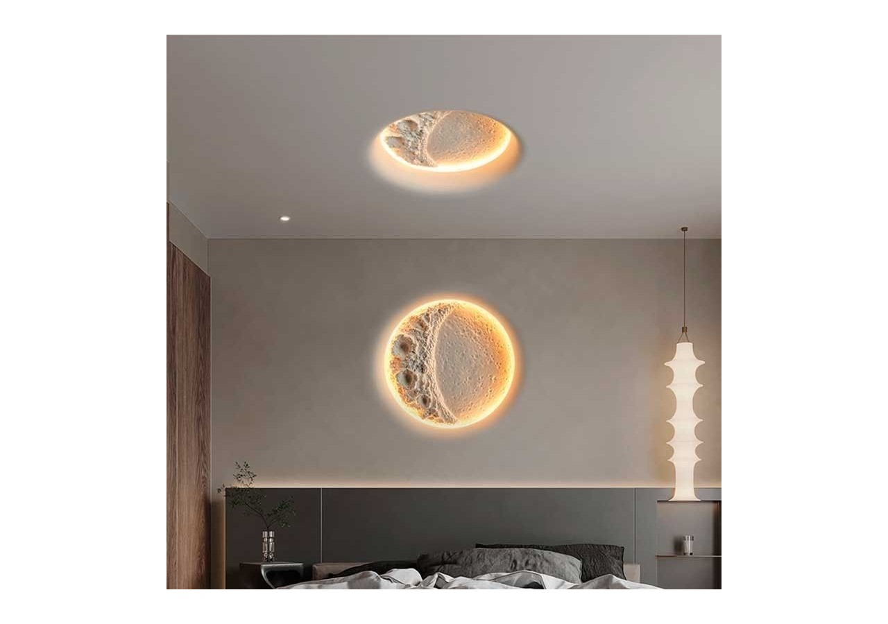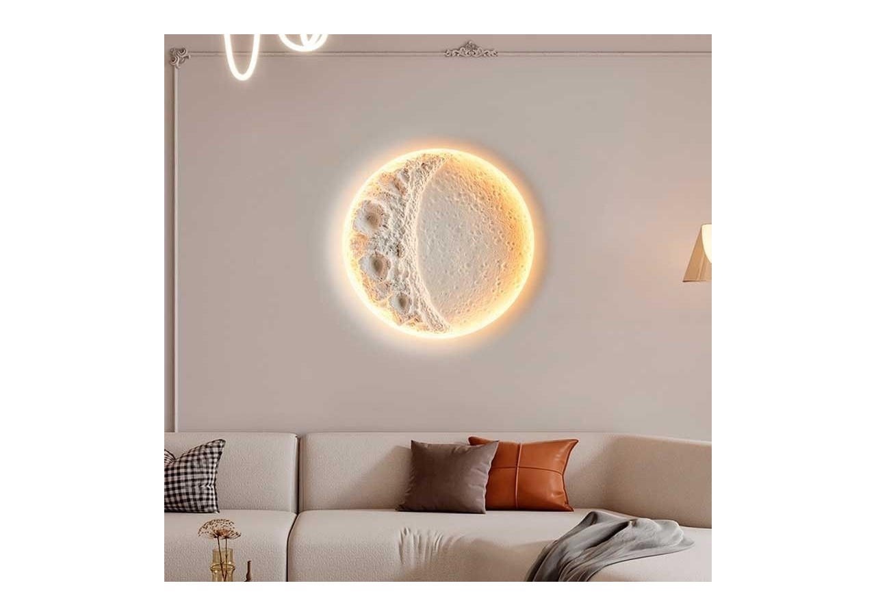 Il est doté d'une source lumineuse intégrée au ton chaud, qui se diffuse doucement à partir de son contour circulaire, laissant ressortir ses textures internes, imitant les reliefs de la lune.