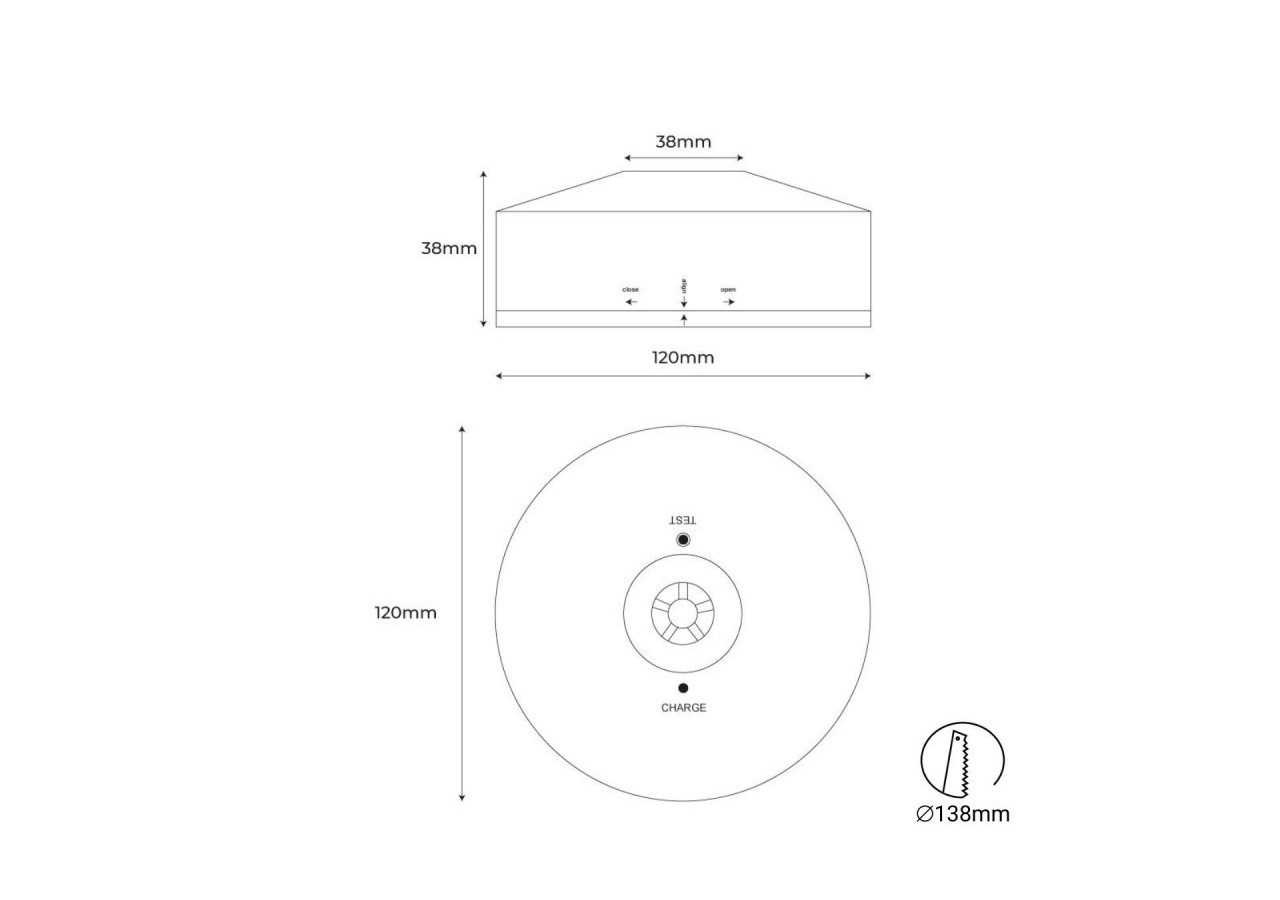 Conformément à la réglementation en vigueur, il dispose d'un bouton "TEST" sur la face frontale du luminaire. L'activation du bloc se produit instantanément après l'interruption de l'alimentation électrique, sans scintillement et sans échauffement.