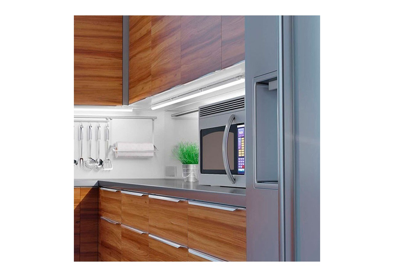 La réglette LED T5 CCT 150 cm pour le dessous du placard de cuisine peut être installée aussi bien au plafond qu'au mur. Elle se connecte directement au courant électrique par son câble de raccordement branché à l'une de ses extrémités.