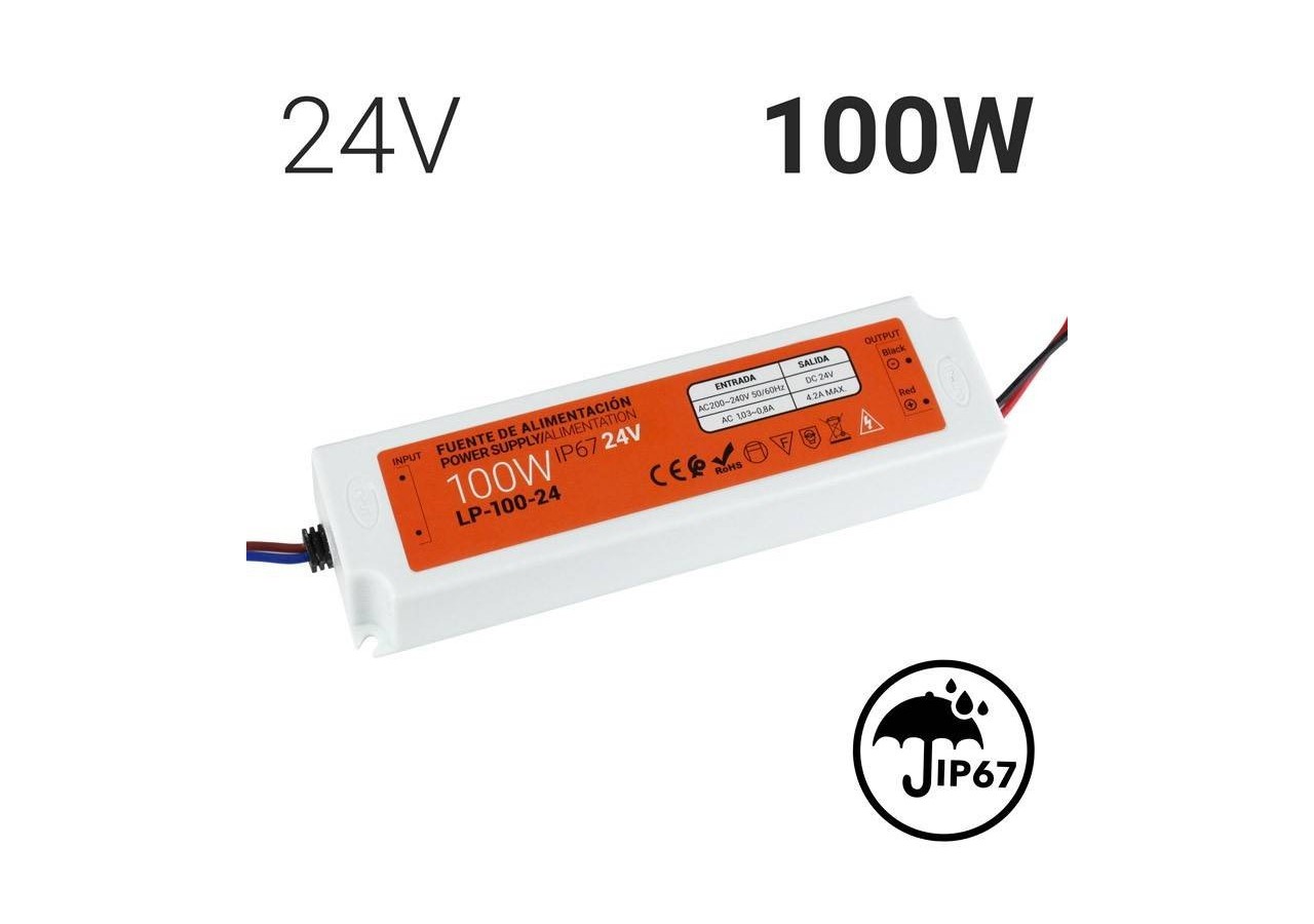 Le bloc d'alimentation étanche de 100W est constitué d'un boîtier plastique compact et robuste pour une utilisation professionnelle en extérieur. Degré de protection IP67, résistant à l'eau, à l'humidité, à la poussière, etc. Protection contre les surcharges, les surchauffes, les courts-circuits, etc. Transformateur parfait pour les luminaires 24V tels que les bandes LED 24V.